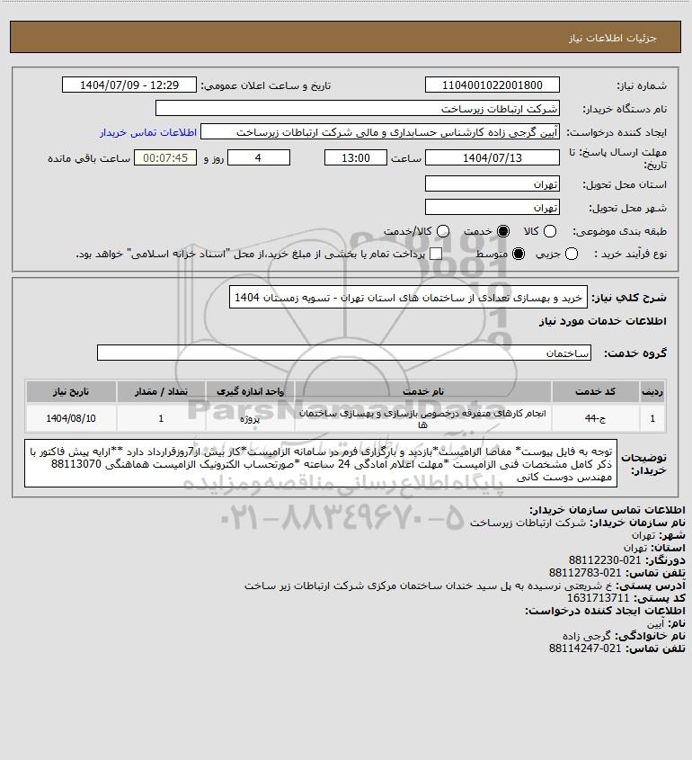 شرح کلی نیاز: خرید و بهسازی تعدادی از ساختمان های استان تهران - تسویه زمستان 1404