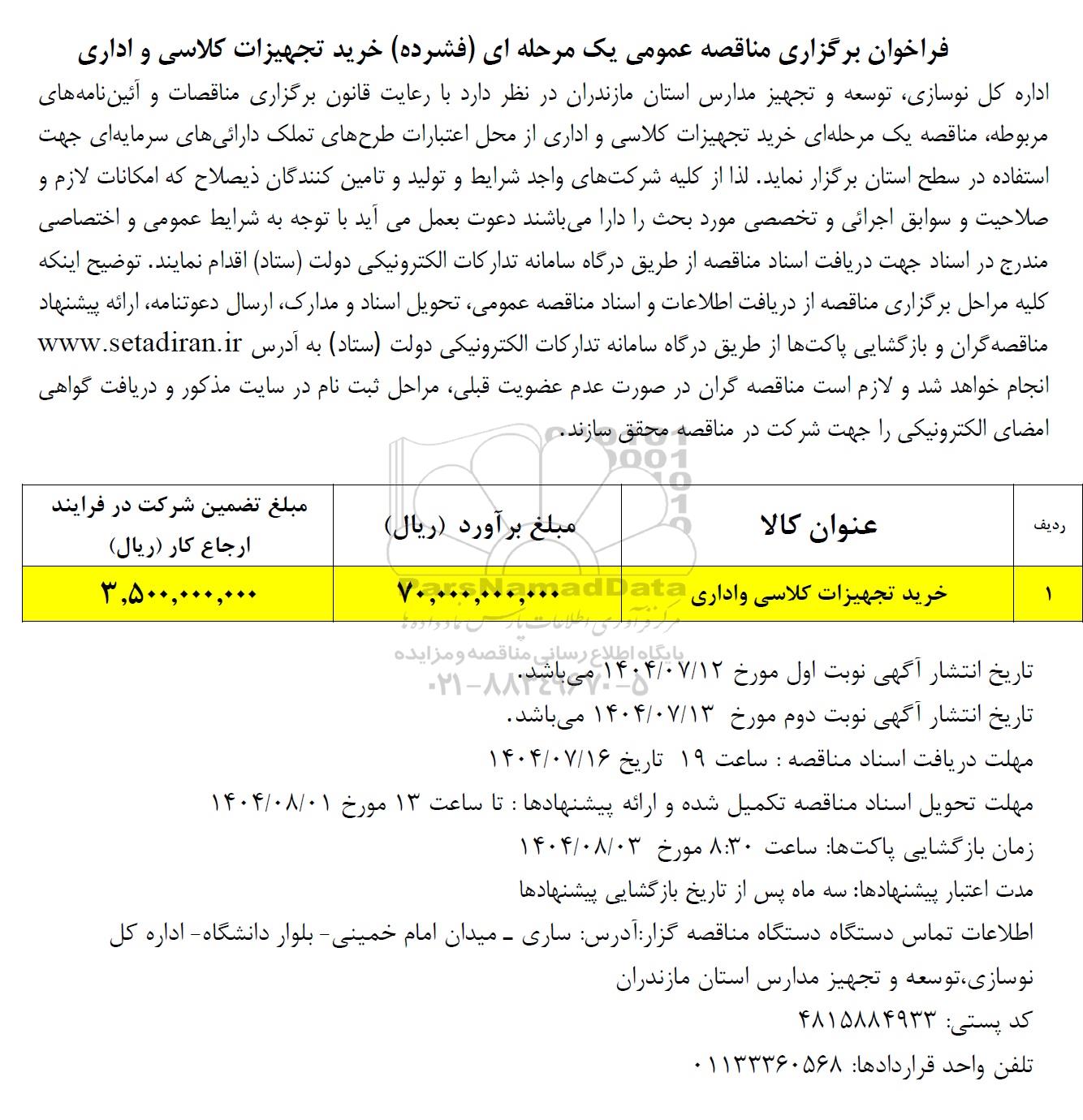 اداره کل نوسازی، توسعه و تجهیز مدارس استان مازندران در نظر دارد با رعایت قانون برگزاری مناقصات و آئین نامه های مربوطه، مناقصه دو مرحله ای خرید تجهیزات کلاسی و اداری  از محل طرح های تملک دارایی های سرمایه ای جهت استفاده در سطح استان برگزار نمایید. لذا از کلیه شرکت های واجد شرایط و تولید و تامین کنندگان ذیصلاح که امکانات لازم و صلاحیت و سوابق اجرائی و تخصصی مورد بحث را دارا می باشند دعوت به عمل می آید با توجه به شرایط عمومی و اختصاصی مندرج در اسناد جهت دریافت اسناد مناقصه از طریق درگاه سامانه تدارکات الکترونیکی دولت ستاد اقدام نمایند. توضیح اینکه کلیه مراحل برگزاری مناقصه از دریافت اطلاعات و اسناد مناقصه عمومی، تحویل اسناد و مدارک ارسال دعوتنامه ارائه پیشنهاد مناقصه گران و بازگشایی پاکتها از طریق درگاه سامانه تدارکات الکترونیکی دولت ستاد به آدرس ستاد انجام خواهد شد و لازم است مناقصه گران در صورت عدم عضویت قبلی مراحل ثبت نام در سایت مذکور و دریافت گواهی امضا الکترونیکی را جهت شرکت در مناقصه محقق سازند.
