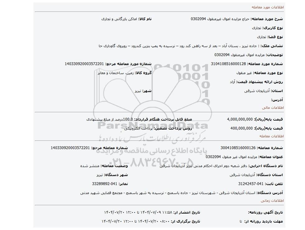 مزایده مزایده اموال غیرمنقول 0302094, مزایده، مزایده اموال غیرمنقول 0302094
