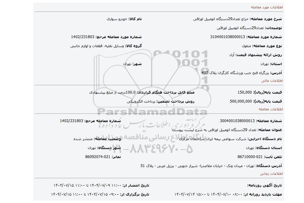 | عنوان معامله: تعداد 29دستگاه اتومبیل اوراقی به شرح لیست پیوست | ||
