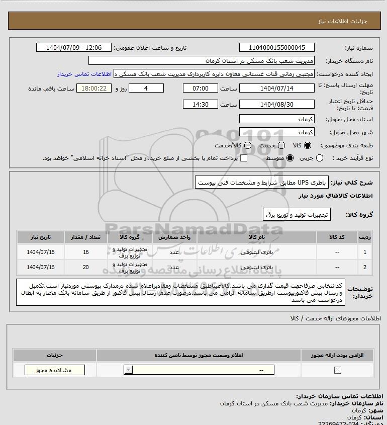 | 2 | -- | باتری لیتیومی | عدد | تجهیزات تولید و توزیع برق | 20 | 1404/07/16 |