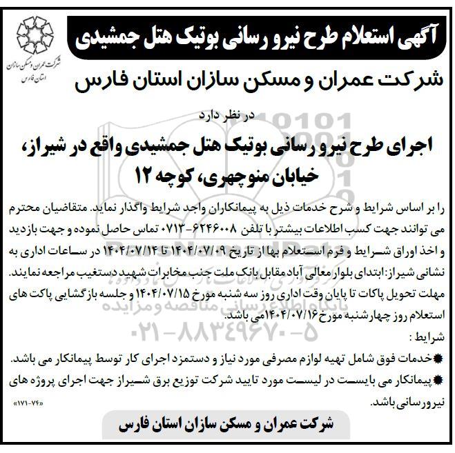 آگهی استعلام طرح نیرو رسانی بوتیک هتل جمشیدی