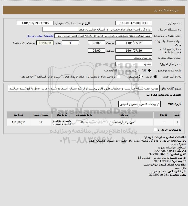 | 1 | -- | دوربین مدار بسته | دستگاه | تجهیزات دفاعی، ایمنی و امنیتی | 41 | 1404/07/14 |