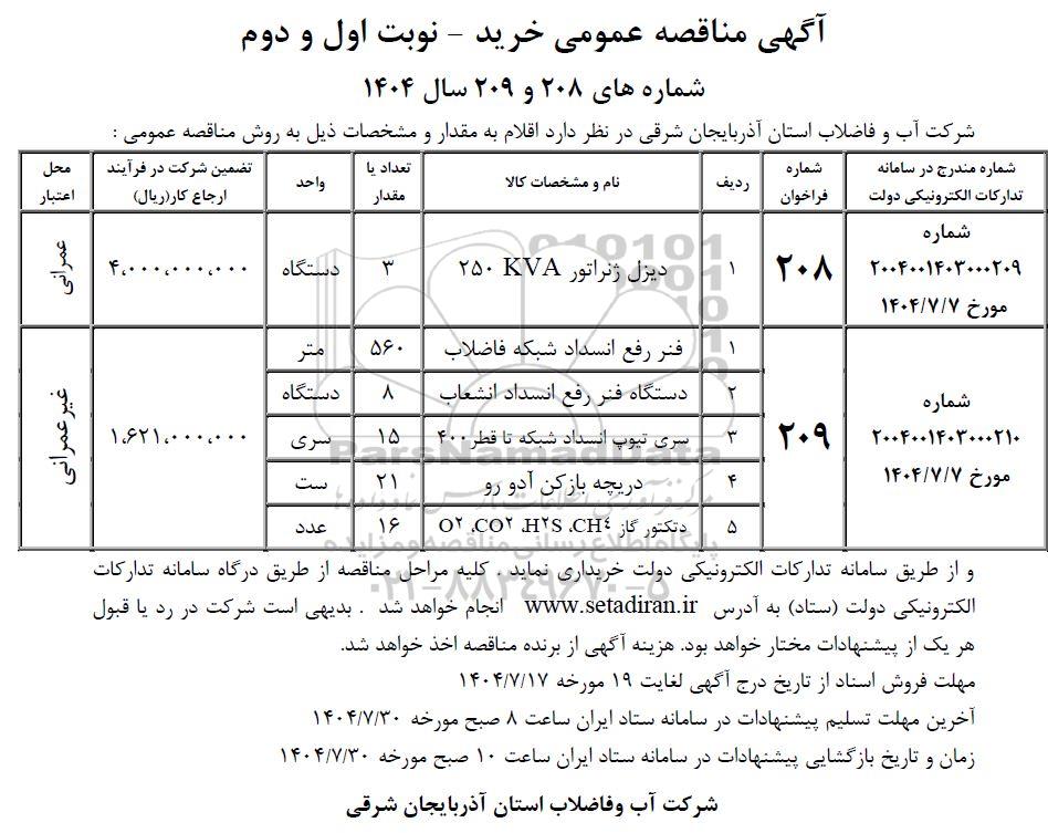 208 | 1 | دیزل ژنراتور 250KVA | 3 | دستگاه | 4.000.000.000 | عمرانی |
