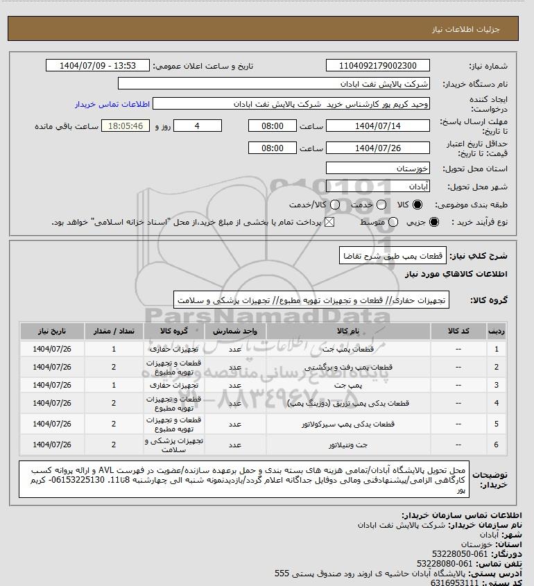 | 1 | -- | قطعات پمپ جت | عدد | تجهیزات حفاری | 1 | 1404/07/26 |