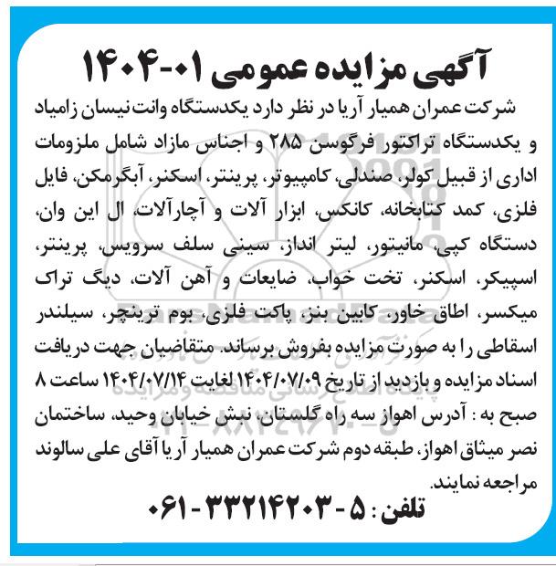 شرکت عمران همیار آریا در نظر دارد یکدستگاه وانت نیسان زامیاد و یکدستگاه تراکتور فرگوسن 285 و اجناس مازاد شامل ملزومات اداری از قبیل کولر، صندلی، کامپیوتر، پرینتر، اسکنر، آبگرمکن، فایل فلزی، کمد کتابخانه، کانکس، ابزار آلات و آچار آلات، ال این وان، دستگاه کپی ، مانیتور، لیتر انداز، سینی سلف سرویس، پرینتر، اسپیکر، اسکنر، تخت خواب، ضایعات و آهن آلات، دیگ تراک میکسر، اطاق خاور، کابین بنز، پاکت فلزی، بوم ترینچر، سیلندر اسقاطی را به صورت مزایده بفروش برساند متقاضیان جهت دریافت اسناد مزایده و بازدید از تاریخ 1404.07.09 لغایت 1404.07.14 ساعت 8 صبح به آدرس اهواز، سه راه گلستان، نبش خیابان وحید، ساختمان نصر میثاق اهواز، طبقه دوم شرکت عمران همیار آریا آقای علی سالوند مراجعه نمایند.