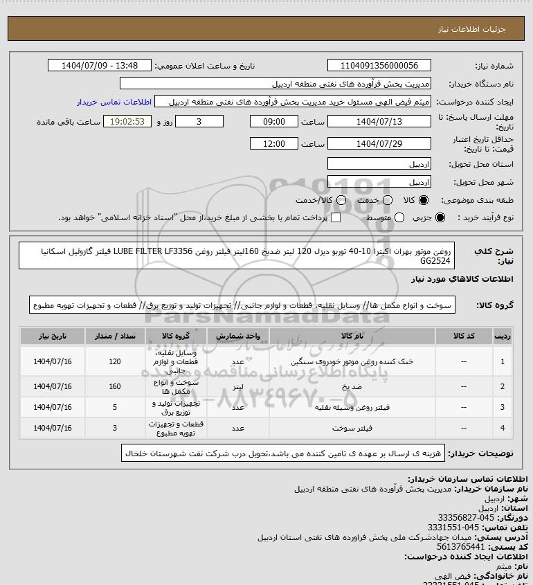 | 3 | -- | فیلتر روغن وسیله نقلیه | عدد | تجهیزات تولید و توزیع برق | 5 | 1404/07/16 |