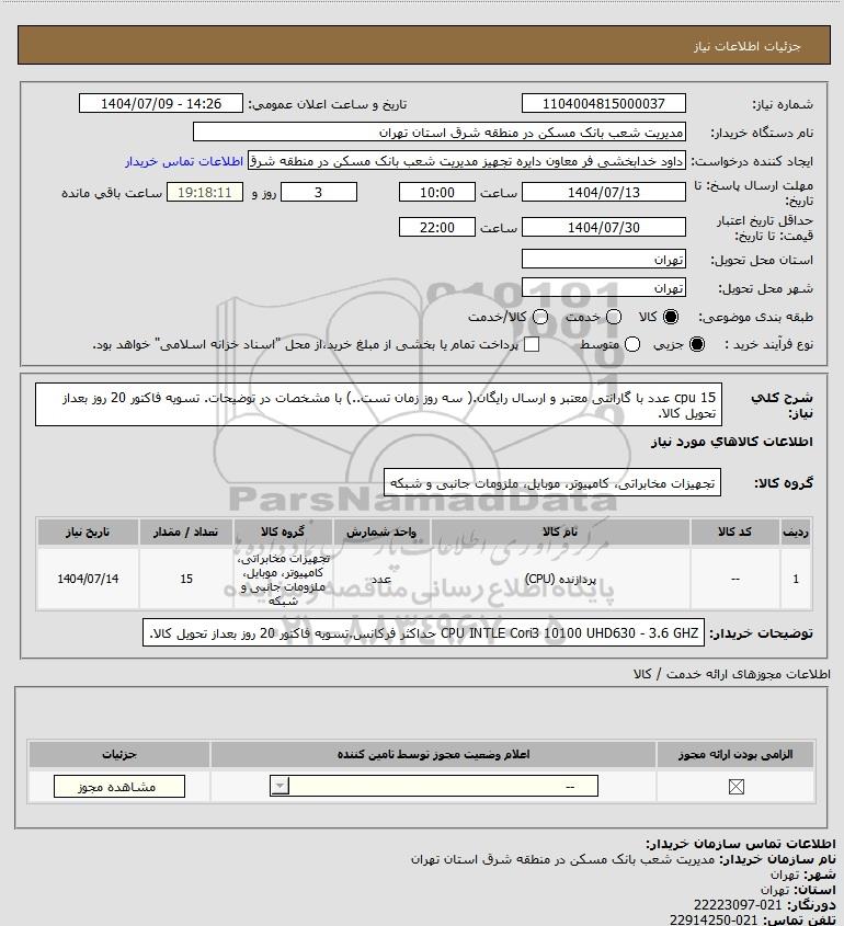 | 1 | -- | پردازنده (CPU) | عدد | تجهیزات مخابراتی، کامپیوتر، موبایل، ملزومات جانبی و شبکه | 15 | 1404/07/14 |