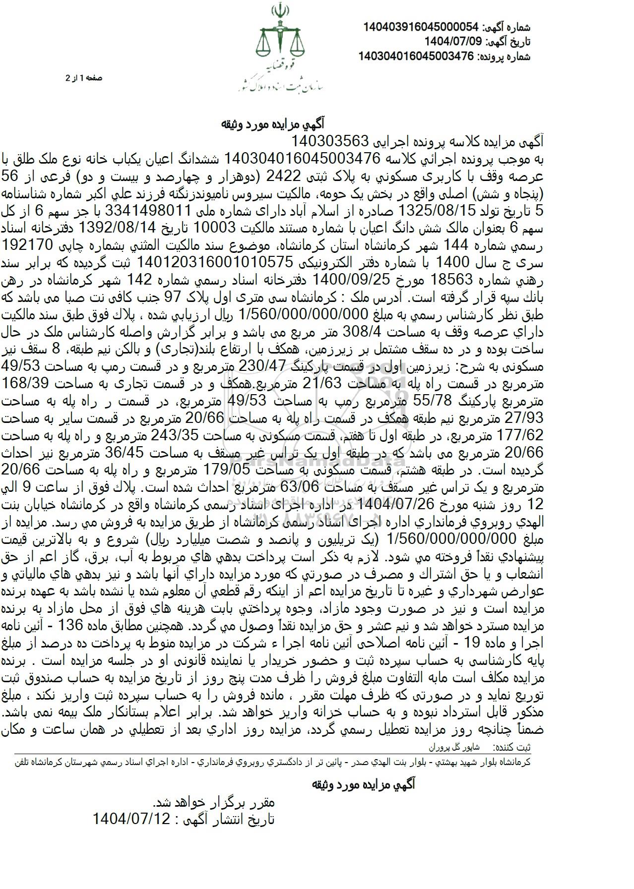 1325.08.15 به موجب پرونده اجرائی کلاسه 140304016045003476 ششدانگ اعیان یکباب خانه نوع ملک طلق با عرصه وقف با کاربری مسکونی به پلاک ثبتی 2422 دوهزار و چهارصد و بیست و دو فرعی از 56 پنجاه و و شش اصلی واقع در بخش یک حومه مالکیت سیروس نامیوند زنگنه فرز فرزند علی اکبر شماره شناسنامه 5 تاریخ تولد 1325.08.15 صادره از از اسلام آباد دارای شماره ملی 3341498011 با جز سهم 6 از از . کل سهم 6 بعنوان مالک شش دانگ اعیان با شماره مستند مالکیت 10003 تاریخ 1392.08.14 دفترخانه اسناد رسمی شماره 144 شهر کرمانشاه استان کرمانشاه موضوع سند مالکیت المثنی بشماره چاپی 192170 سری ج سال 1400 با شماره دفتر الکترونیکی 140120316001010575 ثبت گردیده که برابر سند رهنی شماره 18563 مورخ 1400.09.25 دفترخانه اسناد رسمی شماره 142 شهر کرمانشاه در رهن بانک سپه قرار گرفته است. آدرس ملک: کرمانشاه سی متری اول پلاک 97 جنب کافی نت صبا می باشد که طبق نظر کارشناس رسمی به مبلغ 1.560.000.000.000 ریال ارزیابی شده ، پلاک فوق طبق سند مالکیت دارای عرصه وقف به مساحت 308.4 متر مربع میباشد و برابر گزارش واصله کارشناس ملک در حال ساخت بوده و در ده سقف مشتمل بر زیرزمین همکف با ارتفاع بلند (تجاری) و بالکن نیم طبقه 8 سقف نیز مسکونی به شرح زیرزمین اول در قسمت پارکینگ 230.47 متر مربع و در قسمت رمپ به مساحت 49.53 متر مربع در قسمت راه پله به مساحت 21.63 متر مربع همکف و در قسمت تجاری به مساحت 168.39 متر مربع پارکینگ 55.78 متر مربع رمپ به مساحت 49.53 متر مربع در قسمت و راه پله به مساحت 27.93 متر مربع نیم طبقه همکف در قسمت راه پله به مساحت 20.66 متر مربع در قسمت سایر به مساحت 177.62 متر مربع در طبقه اول تا هفتم قسمت مسکونی به مساحت 243.35 متر مربع و راه پله به مساحت 20.66 متر مربع می باشد که در طبقه اول یک تراس غیر مسقف به مساحت 36.45 متر مربع نیز احداث گردیده است. در طبقه هشتم قسمت مسکونی به مساحت 179.05 متر مربع و راه پله به مساحت 20.66 متر مربع و یک تراس غیر مسقف به مساحت 63.06 متر مربع احداث شده است. پلاک فوق از ساعت 9 الی 12 روز شنبه مورخ 1404.07.26 در اداره اجرای اسناد رسمی کرمانشاه واقع در کرمانشاه خیابان بنت الهدی روبروی فرمانداری اداره اجرای اسناد رسمی کرمانشاه از طریق مزایده به فروش می رسد. مزایده از مبلغ 1.560.000.000.000 یک تریلیون و پانصد و شصت میلیارد ریال شروع و به بالاترین قیمت پیشنهادی نقداً فروخته می شود. لازم به ذکر است پرداخت بدهی های مربوط به آب برق گاز اعم از حق انشعاب و یا حق اشتراک و مصرف در صورتی که مورد مزایده دارای آنها باشد و نیز بدهی های مالیاتی و عوارض شهرداری و غیره تا تاریخ مزایده اعم از اینکه رقم قطعی آن معلوم شده یا نشده باشد به عهده برنده مزایده است و نیز در صورت وجود مازاد وجوه پرداختی بابت هزینه های فوق از محل مازاد به برنده مزایده مسترد خواهد شد و نیم عشر و حق مزایده نقداً وصول می گردد. همچنین مطابق ماده 136 - آئین نامه اجرا و ماده 19 - آئین نامه اصلاحی آئین نامه اجراء شرکت در مزایده منوط به پرداخت ده درصد از مبلغ پایه کارشناسی به حساب سپرده ثبت و حضور خریدار یا نماینده قانونی او در جلسه مزایده است. برنده مزایده مکلف است ما به التفاوت مبلغ فروش را ظرف مدت پنج روز از تاریخ مزایده به حساب صندوق ثبت توریع نماید و در صورتی که ظرف مهلت مقرر، مانده فروش را به حساب سپرده ثبت واریز نکند ، مبلغ مذکور قابل استرداد نبوده و به حساب خزانه واریز خواهد شد برابر اعلام بستانکار ملک بیمه نمی باشد. ضمنا چنانچه روز مزایده تعطیل رسمی گردد مزایده روز اداری بعد از تعطیلی در همان ساعت و مکان مقرر برگزار خواهد شد.