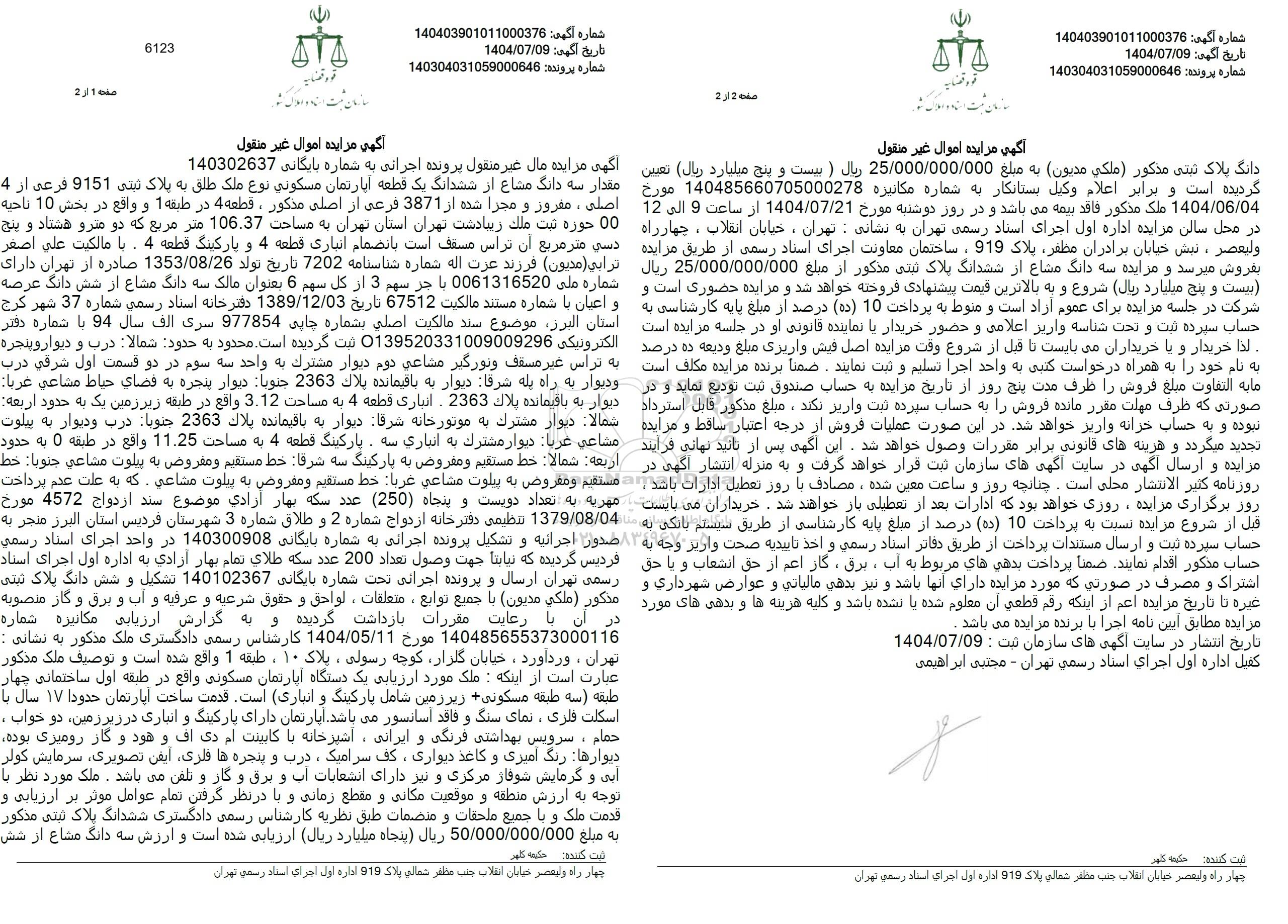 مقدار سه دانگ مشاع از ششدانگ یک قطعه آپارتمان مسکونی نوع ملک طلق به پلاک ثبتی 9151 فرعی از 4 اصلی، مغرور و مجرا شده از 3871 فرعی از اصلی مذکور ، قطعه 4 در طبقه 1 و واقع در بخش 10 ناحیه 00 حوزه ثبت ملک زیبادشت تهران استان تهران به مساحت 106.37 متر مربع که دو مترو هشتاد و پنج دسي متر مربع أن تراس مسقف است بانضمام انباری قطعه 4 و پارکینگ قطعه 4 . با مالکيت علي اصغر ترابی (مدیون) فرزند عزت اله شماره شناسنامه 7202 تاریخ تولد 1353.08.26 صادره از تهران دارای شماره ملی 0061316520 با جز سهم 3 از کل سهم 6 بعنوان مالک سه دانگ مشاع از شش دانگ عرصه و اعیان با شماره مستند مالکیت 67512 تاريخ 1389.12.03 دفترخانه اسناد رسمی شماره 37 شهر کرج استان البرز موضوع سند مالکيت اصلي بشماره چاپی 977854 سری الف سال 94 با شماره دفتر الکترونیکی 139520331009009296 ثبت گردیده است. محدود به حدود شمالا درب و دیوار و پنجره به تراس غیر مسقف و نورگیر مشاعی دوم دیوار مشترک به واحد سه سوم در دو قسمت اول شرقي درب و دیوار به راه پله شرقا دیوار به باقیمانده پلاک 2363 جنوبا دیوار پنجره به فضاي حياط مشاعي غربا دیوار به باقیمانده پلاک 2363 ، انباری قطعه 4 به مساحت 3.12 واقع در طبقه زیرزمین یک به حدود اربعه شمالا دیوار مشترک به موتورخانه شرقا دیوار به باقیمانده پلاک 2363 جنوبا درب و دیوار به پیلوت مشاعی غربا دیوار مشترک به انباری سه . پارکینگ قطعه 4 به مساحت 11.25 واقع در طبقه 0 به حدود اربعه شمالا خط مستقیم و مفروض به پارکینگ سه شرقا خط مستقیم و مفروض به پیلوت مشاعي جنوبا خط مستقيم ومفروض به پیلوت مشاعي غربا خط مستقيم و مفروض به پیلوت مشاعی که به علت عدم پرداخت مهریه به تعداد دویست و پنجاه (250) عدد سکه بهار آزادی موضوع سند ازدواج 4572 مورخ 1379.08.04 تنظیمی دفترخانه ازدواج شماره 2 و طلاق شماره 3 شهرستان فردیس استان البرز منجر به صدور اجرائیه و تشکیل پرونده اجرائی به شماره بایگانی 140300908 در واحد اجرای اسناد رسمی فردیس گردیده که نیابتاً جهت وصول تعداد 200 عدد سکه طلای تمام بهار آزادی به اداره اول اجرای استاد رسمی تهران ارسال و پرونده اجرائی تحت شماره بایگانی 140102367 تشکیل و شش دانگ پلاک تینی مذکور ملکی مدیون با جميع توابع، متعلقات ، لواحق و حقوق شرعیه و عرفیه و آب و برق و گار منصوبه در آن با رعایت مقررات بازداشت گردیده و به گزارش ارزیابی مکانیزه شماره آگهی مزایده مال غیر منقول پرونده اجرائی به شماره بایگانی 140302637 : 140485655373000116 مورخ 1404.05.11 کارشناس رسمی دادگستری ملک مذکور به نشانی تهران ، وردآورد، خیابان گلزار کوچه رسولی، پلاک 10، طبقه 1 واقع شده است و توصیف ملک مذکور عبارت است از اینکه : ملک مورد ارزیابی یک دستگاه آپارتمان مسکونی واقع در طبقه اول ساختمانی چهار طبقه سه طبقه مسکونی + زیرزمین شامل پارکینگ و انباری است. قدمت ساخت آپارتمان حدودا 17 سال با اسکلت فلزی، نمای سنگ و فاقد آسانسور میباشد. آپارتمان دارای پارکینگ و انباری در زیر زمین دو خواب ، حمام ، سرویس بهداشتی فرنگی و ایرانی، آشپزخانه با کابینت ام دی اف و هود و گاز رومیزی بوده دیوارها رنگ امیزی و کاغذ دیواری کف سرامیک درب و پنجره ها فلزی ایفن تصویری سرمایش کولر آبی و گرمایش شوفاز مرکزی و نیز دارای انشعابات آب و برق و گاز و تلفن می باشد. ملک مورد نظر با توجه به ارزش منطقه و موقعیت مکانی و مقطع زمانی و با در نظر گرفتن تمام عوامل موثر بر ارزیابی و قدمت ملک و با جميع ملحقات و منضمات طبق نظریه کارشناس رسمی دادگستری ششدانگ پلاک ثبتی مذکور به مبلغ 50.000.000.000 ريال (پنجاه میلیارد ریال ارزیابی شده است و ارزش سه دانگ مشاع از شش