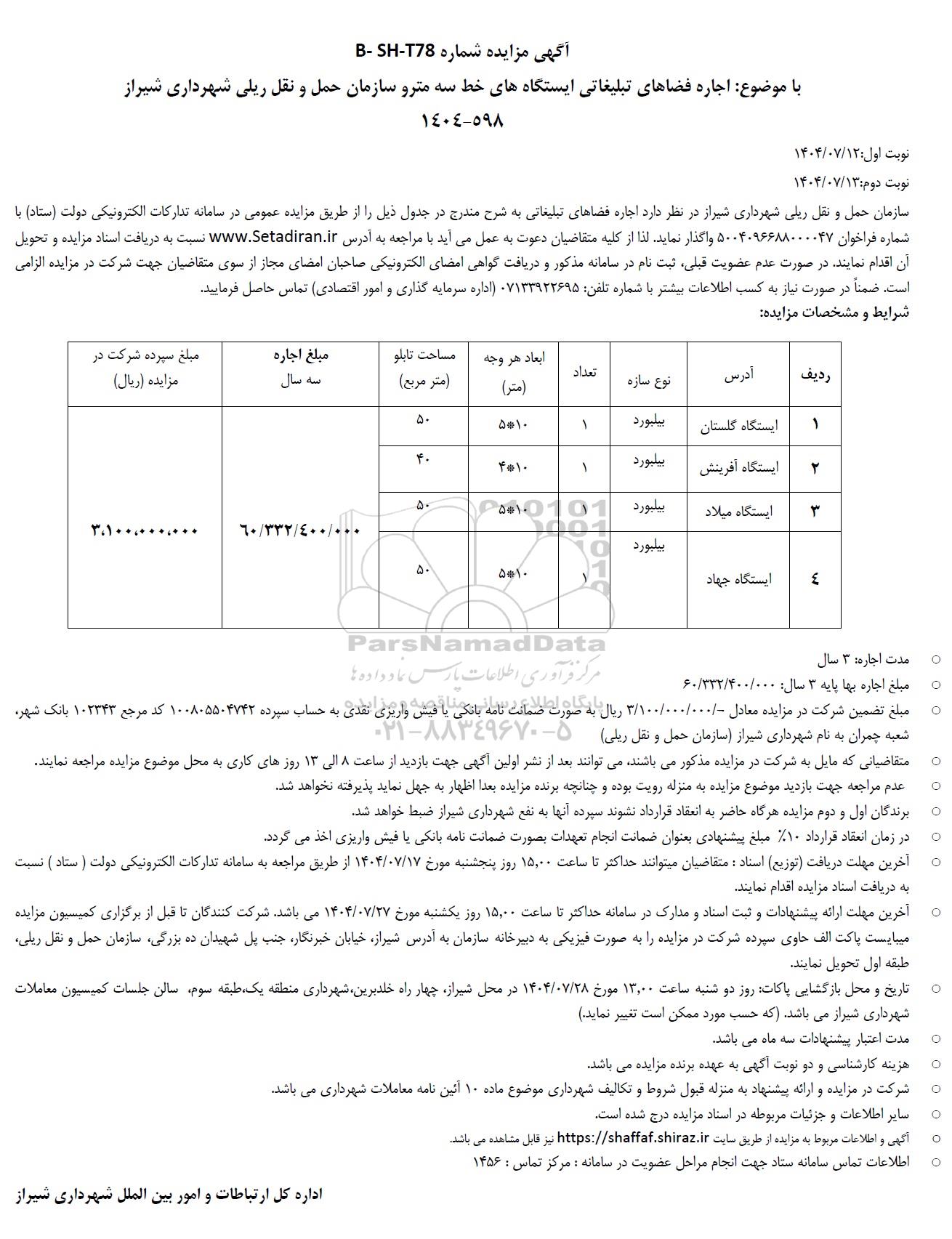 سازمان حمل و نقل ریلی شهرداری شیراز در نظر دارد اجاره فضاهای تبلیغاتی به شرح مندرج در جدول ذیل را از طریق مزایده عمومی در سامانه تدارکات الکترونیکی دولت (ستاد) با شماره فراخوان 5004096688000047 واگذار نماید لذا از کلیه متقاضیان دعوت به عمل می آید با مراجعه به آدرس ستاد ایران نسبت به دریافت اسناد مزایده و تحویل آن اقدام نمایند. در صورت عدم عضویت قبلی ثبت نام در سامانه مذکور و دریافت گواهی امضای الکترونیکی صاحبان امضای مجاز از سوی متقاضیان جهت شرکت در مزایده الزامی است. ضمناً در صورت نیاز به کسب اطلاعات بیشتر با شماره تلفن: 07133922695 (اداره سرمایه گذاری و امور اقتصادی) تماس حاصل فرمایید.