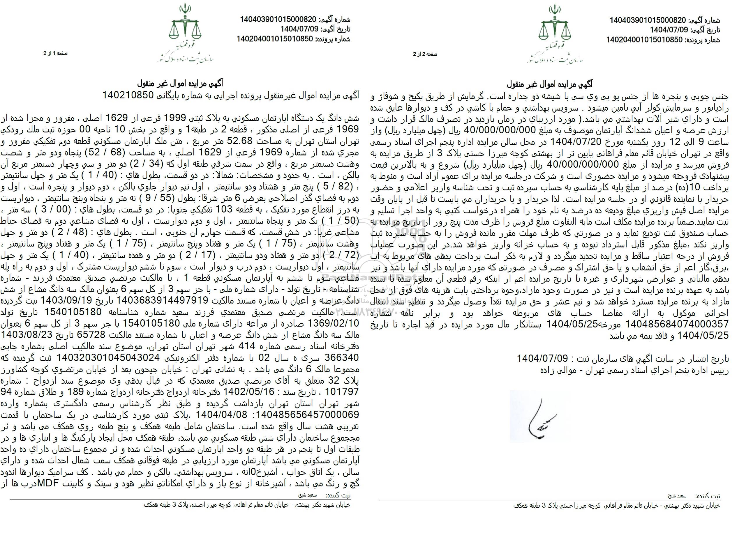 شش دانگ یک دستگاه آپارتمان مسکونی به پلاک ثبتی 1999 فرعی از 1629 اصلی ، مغرور و مجرا شده از 1969 فرعی از اصلی مذکور، قطعه 2 در طبقه 1 و واقع در بخش 10 ناحیه 00 حوزه ثبت ملك رودكی تهران استان تهران به مساحت 52.68 متر مربع ، متن ملک آپارتمان مسکونی قطعه دوم تفكیكی مفروز و مجزی شده از شماره 1969 فرعی از 1629 اصلی ، به مساحت (68) . (52) پنجاه و دو متر و شصت و هشت دسیمتر مربع واقع در سمت شرقی طبقه اول که (34) . (2) دو متر و سی و چهار دسیمتر مربع آن بالکن، است. به حدود و مشخصات شمالا در دو قسمت بطول های : (40 . 1 ) یک متر و چهل سانتیمتر (82 . 5 ) پنج متر و هشتاد و دو سانتیمتر، اول تیم دیوار جلوی بالكن ، دوم دیوار و پنجره است. اول و دوم به فضای گذر اصلاحی بعرض 6 متر شرقا بطول 55 . 9 ) نه متر و پنجاه وپنج سانتیمتر ، دیواریست به درز انقطاع مورد تفکیک به قطعه 103 تفكیكی جنوبا در دو قسمت بطولهای : (00 . 3 ) سه متر . (1.50) یک متر و پنجاه سانتیمتر، اول و دوم دیواریست، اول به فضای مشاعی دوم به فضای حیاط مشاعی غربا در شش قسمت که قسمت چهارم آن جنوبی است. بطول های : (48) . 2 ) دو متر و چهل و هشت سانتیمتر (75 . 1 ) یک متر و هفتاد و پنج سانتیمتر ، (75 . 1 ) یک متر و هفتاد و پنج سانتیمتر . (72 . 2 ) دو متر و هفتاد و دو سانتیمتر ، (17) . 2 ) دو متر و هفده سانتیمتر (40 . 1 ) یک متر و چهل سانتیمتر، اول دیواریست ، دوم درب و دیوار است، سوم تا ششم دیواریست مشترک ، اول و دوم به راه پله مشاعی سوم تا ششم به آپارتمان مسکونی قطعه 1 ، با مالكیت مرتضی صدیق معتمدی فرزند - شماره شناسنامه - تاریخ تولد - دارای شماره ملی - با جز سهم 3 از کل سهم 6 بعنوان مالک سه دانگ مشاع از شش دانگ عرصه و اعیان با شماره مستند مالکیت 1403683914497919 تاریخ 1403.09.19 ثبت گردیده است. مالکیت مرتضی صدیق معتمدی فرزند سعید شماره شناسنامه 1540105180 تاریخ تولد 1369.02.10 صادره از مراغه دارای شماره ملی 1540105180 با جز سهم 3 از کل سهم 6 بعنوان مالک سه دانگ مشاع از شش دانگ عرصه و اعیان با شماره مستند مالکیت 65728 تاریخ 1403.08.23 دفترخانه اسناد رسمی شماره 414 شهر تهران استان تهران موضوع سند مالکیت اصلی بشماره چاپی 366340 سریه سال 02 با شماره دفتر الکترونیکی 140320301045043024 ثبت گردیده که مجموعا مالک 6 دانگ می باشد . به نشانی تهران : خیابان جیحون بعد از خیابان مرتضوی کوچه کشاورز پلاک 32 متعلق به آقای مرتضی صدیق معتمدی که در قبال بدهی وی موضوع سند ازدواج : شماره 101797، تاریخ سند : 1402.05.16 دفترخانه ازدواج دفترخانه ازدواج شماره 189 و طلاق شماره 94 شهر تهران استان تهران بازداشت گردیده و طبق نظر کارشناس رسمی دادگستری بشماره وارده 140485656457000069 : 1404.04.08 پلاک ثبتی مورد کارشناسی در یک ساختمان با قدمت تقریبی هشت سال واقع شده است. ساختمان شامل طبقه همکف و پنج طبقه روی همکف می باشد و تر مججموع ساختمان دارای شش طبقه مسکونی میباشد طبقه همکف محل ایجاد پارکینگها و انباری ها و در طبقات اول تا پنجم در هر طبقه دو واحد آپارتمان مسکونی احداث شده و در مجموع ساختمان دارای ده واحد آپارتمان مسکونی می باشد آپارتمان مورد ارزیابی در طبقه فوقانی همکف سمت شمال احداث شده و دارای سالن ، یک اتاق خواب اشپرخ 0ا نه، سرویس بهداشتی بالکن و حمام میباشد. کف سرامیک دیوارها اندود گج و رنگ می باشد. آشپرخانه از نوع باز و دارای امکاناتی نظیر هود و سینک و کابینت MDF درب ها از جنس چوبی و پنجره ها از جنس یو پی وی سی با شیشه دو جداره است. گرمایش از طریق پکیج و شوفار و رادیاتور و سرمایش کولر ابی تامین میشود. سرویس بهداشتی و حمام با کاشی در کف و دیوارها عایق شده است و دارای شیر آلات بهداشتی می باشد. مورد ارزیبای در زمان بازدید در تصرف مالک قرار داشت و ارزش عرصه و اعیان ششدانگ آپارتمان موصوف به مبلغ 40.000.000.000 ریال چهل میلیارد ریال و از ساعت 9 الی 12 روز یکشنبه مورخ 1404.07.20 در محل سالن مزایده اداره پنجم اجرای اسناد رسمی واقع در تهران خیابان قائم مقام فراهانی پایین تر از بهشتی کوچه میرزا حسنی پلاک 3 از طریق مزایده به فروش میرسد و مزایده از مبلغ 40.000.000.000 ریال چهل میلیارد 