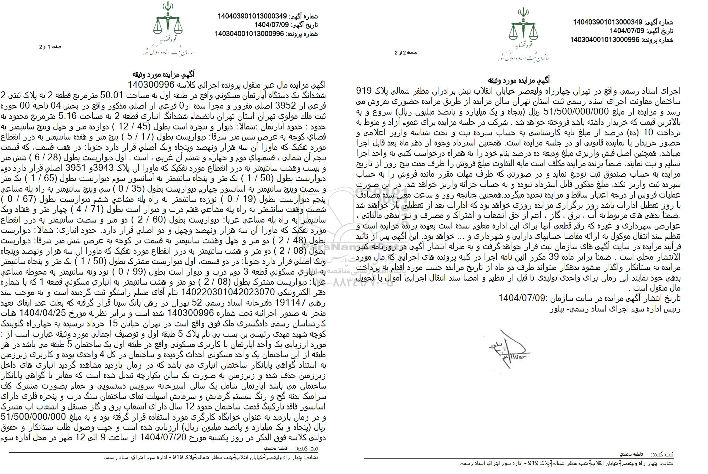 آگهی مزایده مال غیر منقول پرونده اجرائی کلاسه 140300996 ششدانگ یک دستگاه آپارتمان مسکونی واقع در طبقه اول به مساحت 50.01 متر مربع قطعه 2 به پلاک ثبتی 2 فرعی از 3952 اصلی مفروز و مجزا شده از 0 فرعی از اصلی مذکور واقع در بخش 04 ناحيه 00 حوزه ثبت ملك مولوی تهران استان تهران بانضمام ششدانگ انباری قطعه 2 به مساحت 5.16 متر مربع محدود به حدود : حدود آپارتمان شمالا دیوار و پنجره است بطول 45 . 12 ) دوازده متر و چهل و پنج سانتیمتر به فضای کوچه به عرض شش متر شرقا ديواريست بطول 17 . 5 ) پنج متر و هفده سانتیمتر به درز انقطاع مورد تفکیک که ماورا آن سه هزار و نهصد و پنجاه و یک اصلی قرار دارد جنوبا در هفت قسمت که قسمت پنجم أن شمالي ، قسمتهای دوم و چهارم و ششم آن غربی است. اول دیواریست بطول (28 . 6 ) شش متر و بیست و هشت سانتیمتر به درز انقطاع مورد تفکیک که ماورا آن پلاک 3943 و 3951 اصلی قرار دارد دوم دیواریست بطول 50 . 1 ) یک متر و پنجاه سانتیمتر به آسانسور سوم دیواریست بطول (65 . 1 ) یک متر و شصت و پنج سانتیمتر به آسانسور چهارم دیواریست بطول (35) . 0 ) سی وپنج سانتیمتر به راه پله مشاعی پنجم دیواریست بطول (19) . 0 ) نوزده سانتیمتر به راه پله مشاعی ششم دیواریست بطول (67 . 0 ) شصت و هفت سانتیمتر به راه پله مشاعی هفتم درب و دیوار است بطول (71 . 4) چهار متر و هفتاد و یک سانتیمتر به راه پله مشاعی غربا دیواریست بطول 60 . 2 ) دو متر و شصت سانتیمتر به درز انقطاع مورد تفکیک که ماورا آن سه هزار و نهصد و چهل و دو اصلي قرار دارد حدود انباری شمالا دیواریست بطول 48 . 2 ) دو متر و چهل و هشت سانتیمتر به قسمت بر کوچه به عرض شش متر شرقا دیواریست بطول 08 . 2 ) دو متر و هشت سانتیمتر به درز انقطاع مورد تفکیک که ماورا آن سه هزار و نهصد و پنجاه و یک اصلی قرار دارد جنوبا در دو قسمت اول دیواریست مشترک بطول 1.50) یک متر و پنجاه سانتیمتر به انباري مسکوني قطعه 3 دوم درب و دیوار است بطول 99 . 0 ) نود و نه سانتيمتر به محوطه مشاعی غربا دیواریست مشترك بطول 08 . 2 ) دو متر و هشت سانتیمتر به انباري مسکوني قطعه 1 که با شماره دفتر الکترونیکی 140220301042023070 بنام آقای مسلم راستگو ثبت گردیده است و به موجب سند رهنی 191147 دفترخانه اسناد رسمی 52 تهران در رهن بانک سینا قرار گرفته که بعلت عدم ایفای تعهد منجر به صدور اجرائیه تحت شماره 140300996 شده است و برابر نظریه مورخ 1404.04.25 هيات کارشناسان رسمی دادگستری ملک فوق واقع است در تهران خیابان 15 خرداد نرسیده به چهارراه گلوبندک کوچه شهید مهدی رئیسی بن بست بی نام پلاک 5 طبقه اول و توصیف اجمالی مورد وثیقه عبارت است از : مورد ارزیابی یک واحد آپارتمان با کاربری مسکونی واقع در طبقه اول یک ساختمان 5 طبقه می باشد در هر طبقه از این ساختمان یک واحد مسکونی احداث گردیده و ساختمان در کل 4 واحدی بوده و کاربری زیرزمین به استناد گواهی پایانکار ساختمان انباری میباشد که در زمان بازدید مشاهده گردید انباری های داخل زیر زمین حذف شده و زیرزمین به صورت یک سالن یکپارچه تبدیل شده است که مغایر با گواهی پایانکار ساختمان می باشد آپارتمان شامل یک سالن اشپزخانه سرویس دستشویی و حمام بصورت مشترک کف سرامیک بدنه گج و رنگ سیستم گرمایش و سرمایش اسپیلت نمای ساختمان سنگ درب و پنجره فلزی دارای اسانسور فاقد پارکینگ قدمت ساختمان حدود 12 سال دارای انشعاب برق و گاز مستقل و انشعاب آب مشترک و در زمان بازدید به عنوان خوابگاه کارگری مورد استفاده قرار گرفته بود و به مبلغ 51.500.000.000 ریال پنجاه و یک میلیارد و پانصد میلیون ریال ارزیابی شده است و جهت وصول طلب بستانکار و حقوق دولتی کلاسه فوق الذکر در روز یکشنبه مورخ 1404.07.20 از ساعت 9 الی 12 ظهر در محل اداره سوم اجرای اسناد رسمی واقع در تهران چهارراه ولیعصر خیابان انقلاب نبش برادران مظفر شمالی پلاک 919 ساختمان معاونت اجرای اسناد رسمی ثبت استان تهران سالن مزایده از طریق مزایده حضوری بفروش می رسد و مزایده از مبلغ 51.500.000.000 ریال پنجاه و یک میلیارد و پانصد میلیون ریال شروع و به بالاترین قیمت که خریدار داشته باشد ف