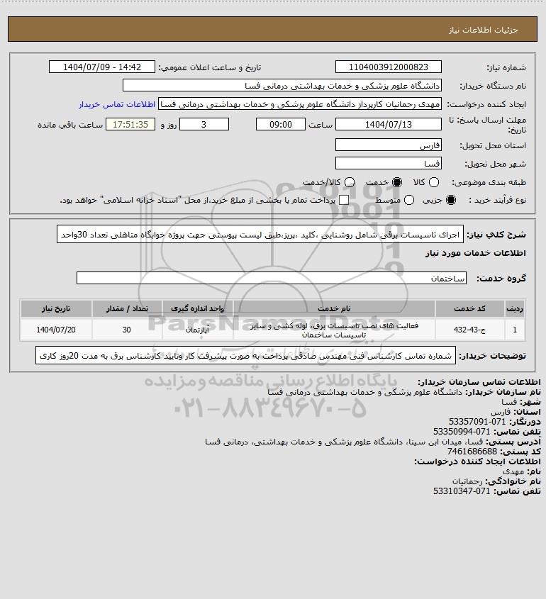 شرح کلی نیاز: اجرای تاسیسات برقی شامل روشنایی ،کلید ،پریز،طبق لیست پیوستی جهت پروژه خوابگاه متاهلی تعداد 30واحد