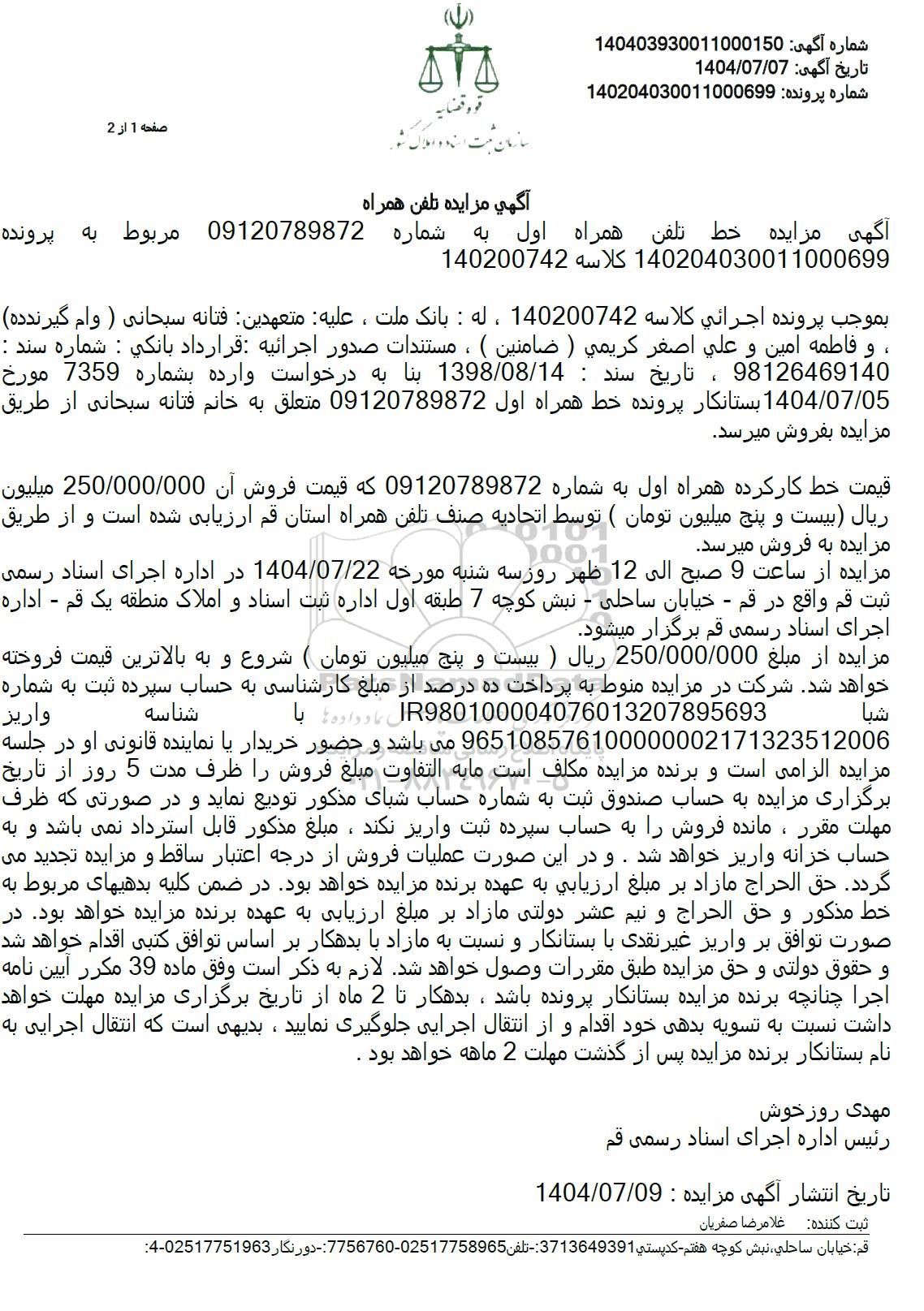 آگهی مزایده خط تلفن همراه اول به شماره 09120789872 مربوط به پرونده 140200742 140204030011000699 کلاسه بموجب پرونده اجرائي كلاسه 140200742 ، له : بانک ملت ، عليه متعهدين فتانه سبحانی ) وام گیرندده ، و فاطمه امین و علي اصغر كريمي ) ) ضامنين ) ، مستندات صدور اجرائیه قرارداد بانكي : شماره سند : 98126469140 ، تاریخ سند : 1398.08.14 بنا به درخواست وارده بشماره 7359 مورخ 1404.07.05 بستانکار پرونده خط همراه اول 09120789872 متعلق به خانم فتانه سبحانی از طریق مزایده بفروش میرسد.