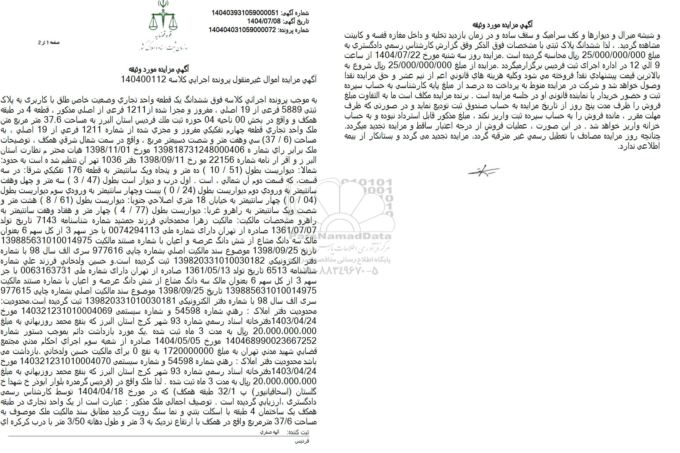 و شیشه میرال و دیوارها و کف سرامیک و سقف ساده و در زمان بازدید تخلیه و داخل مغازه قفسه و کابینت مشاهده گردید ، لذا ششدانگ پلاک ثبتی با مشخصات فوق الذكر وفق گزارش کارشناس رسمی دادگستری به مبلغ 25.000.000.000 ریال محاسبه گردیده است. مزایده روز سه شنبه مورخ 1404.07.22 از ساعت 9 الی 12 در اداره اجرای ثبت فردیس برگزار میگردد. مزایده از مبلغ 25.000.000.000 ریال شروع به بالاترین قیمت پیشنهادی نقداً فروخته می شود و كلیه هزینه های قانونی اعم از نیم عشر و حق مزایده نقدا وصول خواهد شد و شرکت در مزایده منوط به پرداخت ده درصد از مبلغ پایه کارشناسی به حساب سپرده ثبت و حضور خریدار یا نماینده قانونی او در جلسه مزایده است. برنده مزایده مکلف است ما به التفاوت مبلغ فروش را ظرف مدت پنج روز از تاریخ مزایده به حساب صندوق ثبت تودیع نماید و در صورتی که ظرف مهلت مقرر ، مانده فروش را به حساب سپرده ثبت واریز نکند، مبلغ مذکور قابل استرداد نبوده و به حساب خزانه واریز خواهد شد. در این صورت، عملیات فروش از درجه اعتبار ساقط و مزایده تجدید میگردد. چنانچه روز مزایده مصادف با تعطیل رسمی غیر مترقبه ،گردد مزایده تجدید میگردد و بستانکار از بیمه اطلاعی ندارد.