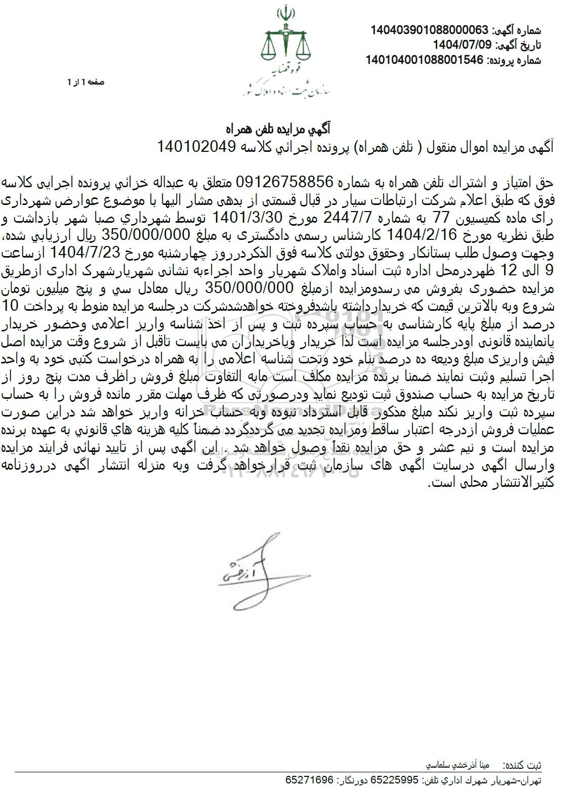 حق امتیاز و اشتراك تلفن همراه به شماره 09126758856 متعلق به عبداله خزائي پرونده اجرایی کلاسه فوق که طبق اعلام شرکت ارتباطات سیار در قبال قسمتی از بدهی مشار الیها با موضوع عوارض شهرداری رای ماده کمیسیون 77 به شماره 2447/7 مورخ 1401.3.30 توسط شهرداري صبا شهر بازداشت و طبق نظریه مورخ 1404.2.16 کارشناس رسمی دادگستری به مبلغ 350.000.000 ریال ارزيابي شده وجهت وصول طلب بستانکار و حقوق دولتی کلاسه فوق الذکر در روز چهارشنبه مورخ 1404.7.23 از ساعت 9 الى 12 ظهر در محل اداره ثبت اسناد و املاک شهریار واحد اجراء به نشانی شهریار شهرک اداری از طریق مزایده حضوری بفروش میرسد و مزایده از مبلغ 350.000.000 ريال معادل سي و پنج میلیون تومان شروع و به بالاترین قیمت که خریدار داشته باشد فروخته خواهد شد شرکت در جلسه مزایده منوط به پرداخت 10 درصد از مبلغ پایه کارشناسی به حساب سپرده ثبت و پس از اخذ شناسه واریز اعلامی و حضور خریدار یا نماینده قانونی او در جلسه مزایده است لذا خریدار و یا خریداران می بایست تا قبل از شروع وقت مزایده اصل فیش واریزی مبلغ ودیعه ده درصد بنام خود و تحت شناسه اعلامی را به همراه درخواست کتبی خود به واحد اجرا تسلیم و ثبت نمایند ضمنا برنده مزایده مکلف است ما به التفاوت مبلغ فروش را ظرف مدت پنج روز از تاریخ مزایده به حساب صندوق ثبت تودیع نماید و در صورتی که ظرف مهلت مقرر مانده فروش را به حساب سپرده ثبت واریز نکند مبلغ مذکور قابل استرداد نبوده و به حساب خزانه واریز خواهد شد در این صورت عملیات فروش از درجه اعتبار ساقط و مزایده تجدید میگردد گردد ضمنا كليه هزينه هاي قانوني به عهده برنده مزایده است و نیم عشر و حق مزايده نقداً وصول خواهد شد. این اگهی پس از تایید نهایی فرایند مزایده و ارسال آگهی در سایت آگهی های سازمان ثبت قرار خواهد گرفت و به منزله انتشار آگهی در روزنامه كثير الانتشار محلی است.