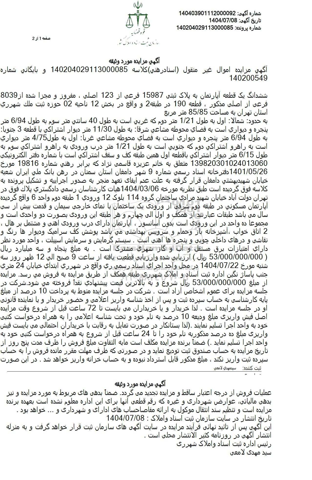 آگهی مزایده اموال غير منقول (استادر هني) كلاسه 140204029113000085 و بایگانی شماره ششدانگ یک قطعه آپارتمان به پلاک ثبتی 15987 فرعی از 123 اصلی، مفروز و مجزا شده از 8039 فرعی از اصلی مذکور ، قطعه 190 در طبقه 2 و واقع در بخش 12 ناحیه 02 حوزه ثبت ملك شهرري استان تهران به مساحت 85.85 متر مربع به حدود شمالا اول به طول 1.21 متر دوم که غربی است به طول 40 سانتي متر سوم به طول 6.94 متر پنجره و دیواری است به فضاي محوطه مشاعي شرقا به طول 11.30 متر ديوار اشتراکی با قطعه 3 جنوبا به طول 6.94 متر پنجره و دیواری است به فضاي محوطه مشاعي غربا اول به طول 4.75 متر ديواري است به راهرو اشتراکي دوم که جنوبی است به طول 1.21 متر درب ورودي به راهرو اشتراكي سوم به طول 6.15 متر دیوار اشتراكي با قطعه اول همین طبقه کف و سقف اشتراکی است با شماره دفتر الکترونیکی 139820301024013060 متعلق به خانم عزیزه قاسمی نژاد که برابر رهنی شماره 19816 مورخ 1401.05.26 دفترخانه اسناد رسمی شماره 9 شهر دامغان استان سمنان در رهن بانک ملی ایران شعبه خیابان شهید بهشتی دامغان قرار گرفته به علت عدم ایفای تعهد منجر به صدور اجراییه و تشکیل پرونده به کلاسه فوق گردیده است طبق نظریه مورخه 1404.03.06 هیات کارشناسان رسمی دادگستری پلاك فوق در تهران دولت آباد خیابان شهید مرادی ساختمان گروه 114 بلوک 12 ورودي 1 طبقه دوم واحد 6 واقع گردیده آپارتمان مسکونی در طبقه دوم شرقی از ورودی یک ساختمان با نمای خارجی سیمان و قدمت بیش از سی سال می باشد طبقات عبارتند از همکف و اول الی چهارم و هر طبقه این ورودی بصورت دو واحدی است و مجموعا ده واحد در این ورودی است بدون آسانسور ، آپارتمان دارای درب ورودی اهنی و مشتمل بر هال . 2 اتاق خواب آشپزخانه باز و حمام و سرویس بهداشتی می باشد پوشش کف سرامیک و دیوار ها رنگ و نقاشی و درهای داخلی چوبی و پنجره ها آهنی است. سیستم گرمایش و سرمایش اسپیلت ، واحد مورد نظر دارای امتیازات برق مستقل و آب و گاز شهری مشترک است به مبلغ پنجاه و سه میلیارد ریال ( 53.000.000.000 ريال ( ارزيابي شده و ارزیابی قطعیت یافته از ساعت 9 صبح الي 12 ظهر روز سه شنبه مورخ 1404.07.22 در محل واحد اجراي اسناد رسمي ري واقع در شهرري ابتداي خيابان 24 متري جنب پاساژ نگین اداره ثبت اسناد و املاک شهرری طبقه همکف از طریق مزایده به فروش می رسد. مزایده از مبلغ 53.000.000.000 ريال شروع و به بالاترین قیمت پیشنهادی نقدا فروخته می شود. شرکت در جلسه مزایده برای عموم اشخاص آزاد است. شرکت در جلسه مزایده منوط به پرداخت 10 درصد از مبلغ پایه کارشناسی به حساب سپرده ثبت و پس از اخذ شناسه واریز اعلامی و حضور خریدار و یا نماینده قانونی او در جلسه مزایده است. لذا خریدار و یا خریداران می بایست تا 72 ساعت قبل از شروع وقت مزایده اصل فیش واریزی مبلغ ودیعه 10 درصد به نام خود و تحت شناسه اعلامی را به همراه درخواست کتبی خود به واحد اجرا تسلیم نمایند . لذا بستانکار در صورت تمایل به رقابت با خریداران احتمالی می بایست فیش واریزی مبلغ ده درصد مذکوریه نام خود را تا 24 ساعت قبل از شروع به همراه درخواست کتبی خود به واحد اجرا تسلیم نماید . ضمناً برنده مزایده مکلف است ما به التفاوت مبلغ فروش را ظرف مدت پنج روز از تاریخ مزایده به حساب صندوق ثبت تودیع نماید و در صورتی که ظرف مهلت مقرر مانده فروش را به حساب سپرده ثبت واریز نکند، مبلغ مذکور قابل استرداد نبوده و به حساب خزانه واریز خواهد شد . در این صورت عملیات فروش از درجه اعتبار ساقط و مزایده تجدید میگردد. ضمناً بدهیهای مربوط به مورد مزایده و نیز بدهی مالیاتی، عوارض شهرداری و غیره که رقم قطعی آنها برای این اداره معلوم نشده است بعهده برنده مزایده است و تنظیم سند انتقال موکول به ارائه مفاصا حسابهای ادارای و شهرداری و .... خواهد بود .