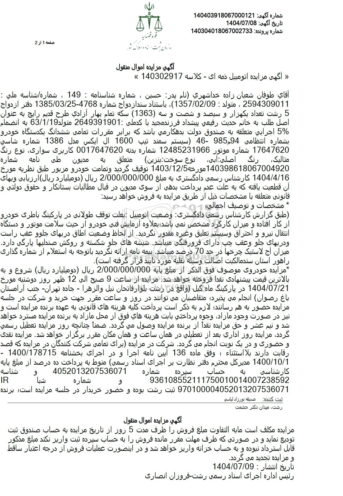 آگهی مزایده اتومبیل ذمه ای - کلاسه 140302917 آقای طوفان شعبان زاده خدا شهری نام پدر حسین، شماره شناسنامه : 149 ، شماره شناسه ملي : 2594309011 ، متولد : 1357/02/09) باستناد سند ازدواج شماره 4768-1385/03/25 دفتر ازدواج 5 رشت تعداد یکهزار و سیصد و شصت و سه (1363) سکه تمام بهار آزادی طرح قدیم رایج به عنوان اصل طلب به خانم حدیث رفیعی پیشداد فرزند مجید با کدملی : 2649391901 متولد 63/1/19 به انضمام %5 اجرایی متعلقه به صندوق دولت بدهکار می باشد که برابر مقررات تمامی ششدانگ یکدستگاه خودرو بشماره انتظامی 94 95 46- سیستم سمند تیپ 1600 ال ایکس مدل 1386 شماره شاسي 17647620 شماره موتور 12485231966 شماره بدنه 0017647620 کاربری سواری، نوع رنگ به مدیون متالیک رنگ اصلی آبی نوع سوخت بنزین متعلق طی نامه شماره 140398618067004920 مورخه 1403.12.5 توقیف گردید و تمامت خودرو مزبور طبق نظریه مورخ 1404/4/16 کارشناس رسمی دادگستری به مبلغ 2/000/000/000 ریال دو میلیارد ریال ارزیابی و بهای آن قطعیت یافته که به علت عدم پرداخت بدهی از سوی مدیون در قبال مطالبات بستانکار و حقوق دولتی و قانونی متعلقه با مشخصات ذیل از طریق مزایده به فروش خواهد رسید