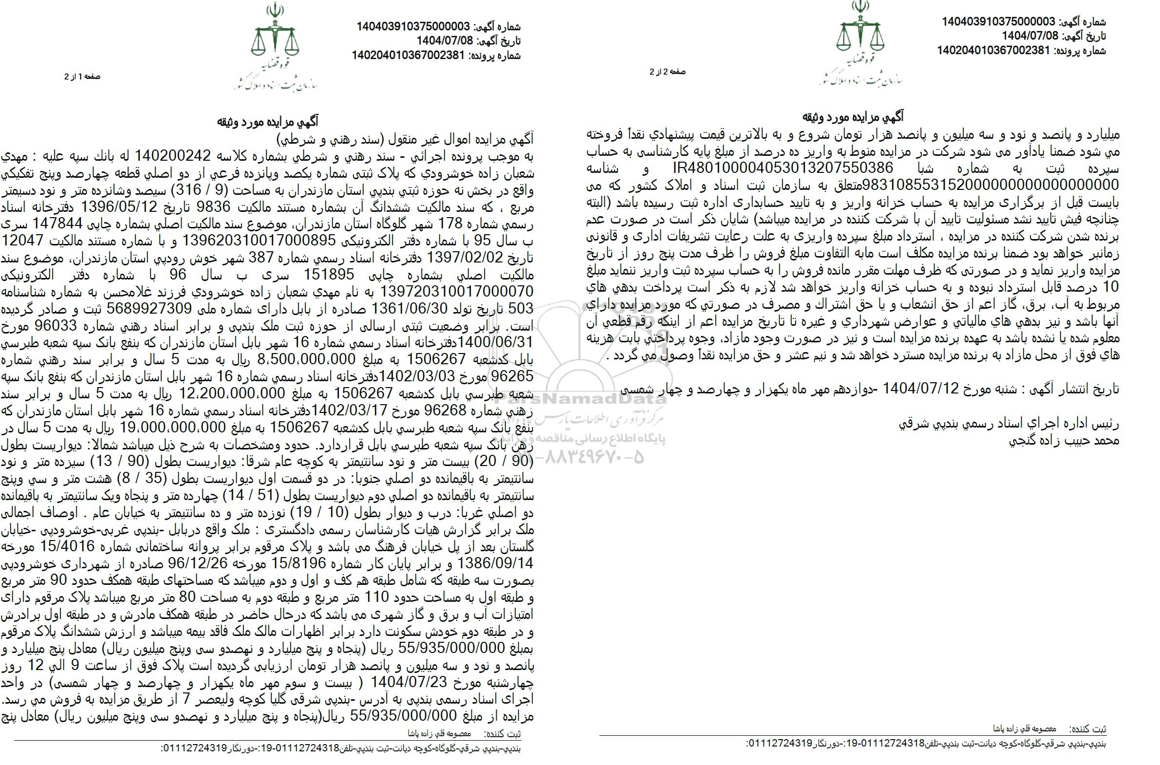 به موجب پرونده اجرائی - سند رهنی و شرطی بشماره كلاسه 140200242 له بانك سپه علیه : مهدی شعبان زاده خوشرودی که پلاک ثبتی شماره یکصد و پانزده فرعی از دو اصلی قطعه چهار صد و پنج تفكیكی واقع در بخش نه حوزه ثبتی بندپی استان مازندران به مساحت 9 / (316) سیصد و شانزده متر و نود دسیمتر مربع ، که سند مالکیت ششدانگ آن بشماره مستند مالکیت 9836 تاریخ 1396/05/12 دفترخانه اسناد رسمی شماره 178 شهر گلوگاه استان مازندران موضوع سند مالکیت اصلی بشماره چاپی 147844 سری ب سال 95 با شماره دفتر الکترونیکی 139620310017000895 و با شماره مستند مالکیت 12047 تاریخ 1397/02/02 دفترخانه اسناد رسمی شماره 387 شهر خوش رودپی استان مازندران موضوع سند مالكیت اصلی بشماره چاپی 151895 سری ب سال 96 با شماره دفتر الکترونیکی 139720310017000070 به نام مهدی شعبان زاده خوشرودی فرزند غلامحسن به شماره شناسنامه 503 تاریخ تولد 1361/06/30 صادره از بابل دارای شماره ملی 5689927309 ثبت و صادر گردیده است. برابر وضعیت ثبتی ارسالی از حوزه ثبت ملک بندپی و برابر اسناد رهنی شماره 96033 مورخ 1400/06/31 دفترخانه اسناد رسمی شماره 16 شهر بابل استان مازندران که بنفع بانک سپه شعبه طبرسی بابل کد شعبه 1506267 به مبلغ 8,500,000,000 ریال به مدت 5 سال و برابر سند رهنی شماره 96265 مورخ 1402/03/03 دفترخانه اسناد رسمی شماره 16 شهر بابل استان مازندران که بنفع بانک سپه شعبه طبرسی بابل کد شعبه 1506267 به مبلغ 200،000،000، 12 ریال به مدت 5 سال و برابر سند رهنی شماره 96268 مورخ 1402/03/17 دفترخانه اسناد رسمی شماره 16 شهر بابل استان مازندران که بنفع بانک سپه شعبه طبرسی بابل کد شعبه 1506267 به مبلغ 19،000،000،000 ریال به مدت 5 سال در رهن بانک سپه شعبه طبرسی بابل قرار دارد حدود و مشخصات به شرح ذیل میباشد شمالا دیواریست بطول (90 / 20) بیست متر و نود سانتیمتر به کوچه عام شرقا دیواریست بطول (90) / (13) سیزده متر و نود سانتیمتر به باقیمانده دو اصلی جنوبا در دو قسمت اول دیواریست بطول (35) / (8) هشت متر و سی و پنج سانتیمتر به باقیمانده دو اصلی دوم دیواریست بطول (51) / (14) چهارده متر و پنجاه و یک سانتیمتر به باقیمانده دو اصلی غربا درب و دیوار بطول (10) / (19) نوزده متر و ده سانتیمتر به خیابان عام . اوصاف اجمالی ملک برابر گزارش هیات کارشناسان رسمی دادگستری: ملک واقع در بابل بندپی غربی - خوشرودپی - خیابان گلستان بعد از پل خیابان فرهنگ میباشد و پلاک مرقوم برابر پروانه ساختمانی شماره 15/4016 مورخه 1386/09/14 و برابر پایان کار شماره 15/8196 مورخه 96/12/26 صادره از شهرداری خوشرودپی بصورت سه طبقه که شامل طبقه هم کف و اول و دوم میباشد که مساحتهای طبقه همکف حدود 90 متر مربع و طبقه اول به مساحت حدود 110 متر مربع و طبقه دوم به مساحت 80 متر مربع میباشد پلاک مرقوم دارای امتیازات آب و برق و گاز شهری میباشد که در حال حاضر در طبقه همکف مادرش و در طبقه اول برادرش و در طبقه دوم خودش سکونت دارد برابر اظهارات مالک ملک فاقد بیمه میباشد و ارزش ششدانگ پلاک مرقوم بمبلغ 55.935.000.000 ریال پنجاه و پنج میلیارد و نهصد و سی و پنج میلیون ریال معادل پنج میلیارد و پانصد و نود و سه میلیون و پانصد هزار تومان ارزیابی گردیده است پلاک فوق از ساعت 9 الی 12 روز چهارشنبه مورخ 1404.07.23 ) بیست و سوم مهر ماه یکهزار و چهارصد و چهار شمسی در واحد اجرای اسناد رسمی بندپی به آدرس بندپی شرقی گلیا کوچه ولیعصر 7 از طریق مزایده به فروش می رسد. مزایده از مبلغ 55.935.000.000 ریال پنجاه و پنج میلیارد و نهصد و سی و پنج میلیون ریال معادل پنج