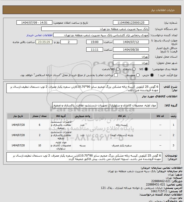 شرح کلی نیاز: 6 گونی 25 کیلویی کیسه زباله مشکی بزرگ ضخیم سایز 90*10،70کارتن سفره یکبار مصرف، 2 توپ دستمال تنظیف،ارسال بر عهده فروشنده می باشد