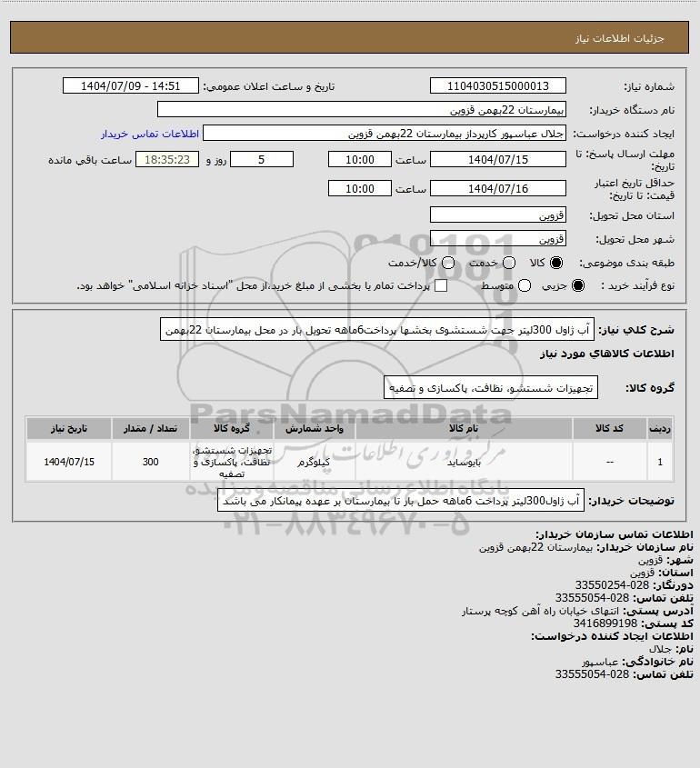 شرح کلی نیاز: آب ژاول 300لیتر جهت شستشوی بخشها پرداخت6ماهه تحویل بار در محل بیمارستان 22بهمن