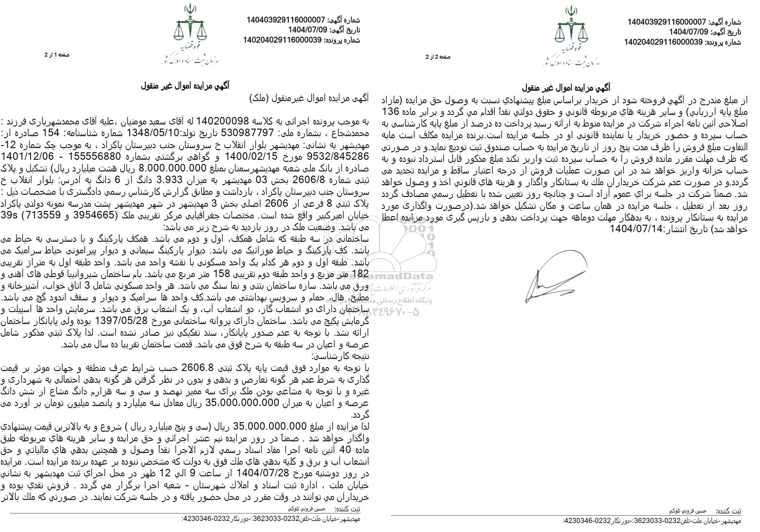 9532.845286 مورخ 1400.02.15 و گواهی برگشتی به موجب پرونده اجرانی به کلاسه 140200098 له آقای سعید مومنیان علیه آقای محمد شهریاری فرزند : محمد شجاع، بشماره ملی 530987797 تاریخ تولد : 1348.05.10 شماره شناسنامه: 154 صادره از مهدیشهر به نشانی مهدیشهر بلوار انقلاب خ سروستان جنب دبیرستان پاکزاد، به موجب یک شماره 12 و گواهی برگشتی بشماره 155556880 - 1401.12.06 صادره از بانک ملی شعبه مهدیشهر سمنان بمبلغ 8.000.000.000 ریال هشت میلیارد ریال) تشکیل و بلاک ثبتی شماره 2606.8 پخش 03 مهدیشهر به میزان 3.933 دانگ از 6 دانگ به آدرس: بلوار انقلاب ج سروستان جب دبیرستان پاکزاد بازداشت و مطابق گزارش کارشناس رسمی دادگستری با مشخصات ذیل : پلاک ثبتی 8 فرعی از 2606 اصلی بخش 3 مهدیشهر در شهر مهدیشهر پشت مدرسه نمونه دولتی پاکزاد خیابان امیرکبیر واقع شده است. مختصات جغرافیایی مرکز تقریبی ملک (3954665 و 713559) 395 می باشد. وضعیت ملک در روز در روز بازدید به شرح زیر می باشد. ساختمانی در سه طبقه که شامل همکف اول و دوم می باشد. همکف پارکینگ و با دسترسی به حیاط می باشد. کف پارکینگ و حیاط موزانیک می باشد. دیوار پارکینگ سیمانی و دیوار پیرامونی حیاط سرامیک می باشد. طبقه اول و دوم هر کدام یک واحد مسکونی با نقشه واحد می باشد. واحد طبقه اول به متراز تقریبی 182 متر مربع و واحد طبقه دوم تقریبی 158 متر مربع می باشد. بام ساختمان شیروانیا قوطی های آهنی و ورق می باشد. سازه ساختمان بنی و نما سنگ می باشد. هر واحد مسكوني شامل 3 اتاق خواب اشپزخانه و مطبخ، قال حمام و سرویس بهداشتی می باشد. کف واحد ها سرامیک و دیوار و سقف اندود گچ می باشد. ساختمان دارای دو انشعاب گار دو انشعاب آب و یک انشعاب برق می باشد. سرمایش واحد ها اسپیلت و گرمایش پکیج می باشد. ساختمان دارای پروانه ساختمانی مورخ 1397.05.28 بوده ولی پایانکار ساختمان ارائه نشد. با توجه به عدم صدور پایانکار سند تفکیکی تیر صادر نشده است. لذا پلاک ثبتی مذکور شامل عرصه و اعیان در سه طبقه به شرح فوق می باشد. قدمت ساختمان تقریبا ده سال می باشد. نتیجه کارشناسی با توجه به موارد فوق قیمت پایه پلاک ثبتی 2606.8 حسب شرایط عرف منطقه و جهات موثر بر قیمت گذاری به شرط عدم هر گونه تعارض و بدهی و بدون در نظر گرفتن هر گونه بدهی احتمالی به شهرداری و غیره و با توجه به مشاعی بودن ملک برای سه ممیز نهصد و سی و سه قرارم دانگ مشاع از شیش دانگ عرصه و اعیان به میزان 35.000.000.000 ريال معادل سه میلیارد و پانصد میلیون تومان بر آورد می گردد.