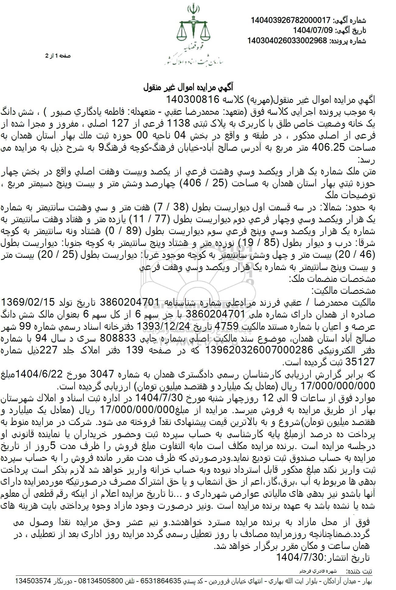 به موجب پرونده اجرایی کلاسه فوق متعهد: محمدرضا عقبي - متعهدله فاطمه یادگاری صبور ) ، شش دانگ یک خانه وضعیت خاص طلق با کاربری به پلاک ثبتی 1138 فرعی از 127 اصلی ، مفروز و مجزا شده از فرعی از اصلی مذکور، در طبقه و واقع در بخش 04 ناحیه 00 حوزه ثبت ملك بهار استان همدان به مساحت 406.25 متر مربع به آدرس صالح آباد - خیابان فرهنگ - کوچه فرهنگ و به شرح ذیل به مزایده می رسد