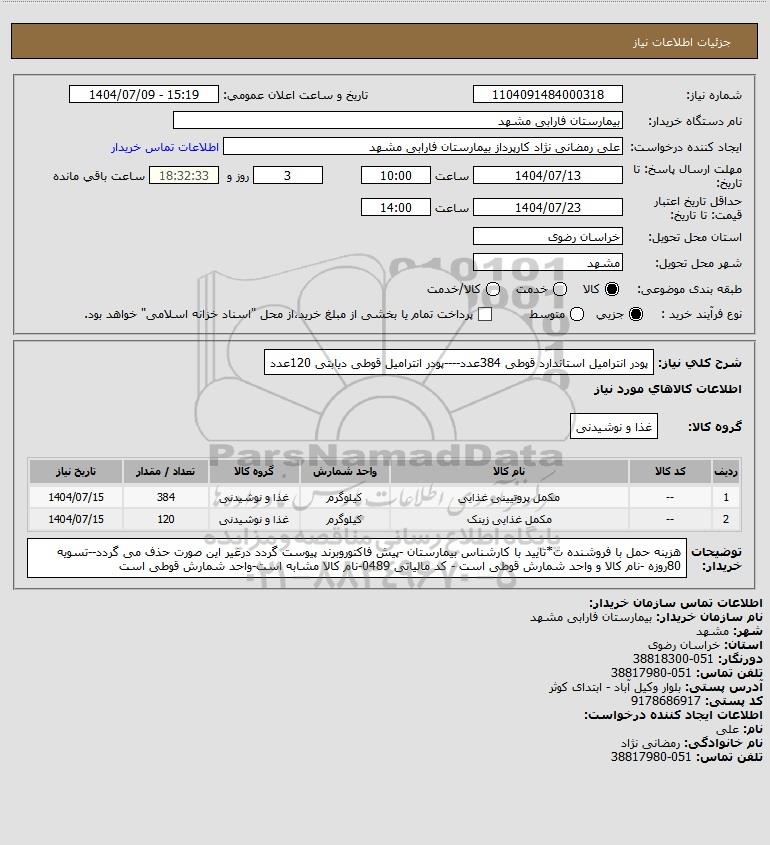 شرح کلی نیاز: پودر انترامیل استاندارد قوطی 384عدد----پودر انترامیل قوطی دیابتی 120عدد