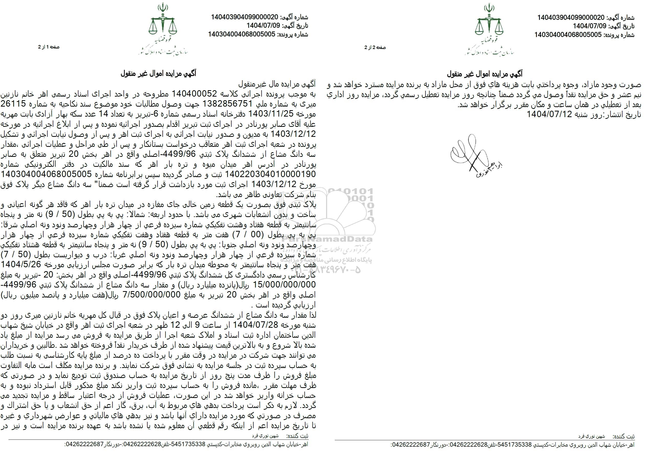 به موجب پرونده اجرانی کلاسه 140400052 مطروحه در واحد اجرای اسناد رسمی اهر خانم نازنین میری به شماره ملی 1382856751 جهت وصول مطالبات خود موضوع سند نکاحیه به شماره 26115 مورخه 1403.11.25 دفترخانه اسناد رسمی شماره -6 تبریز به تعداد 14 عدد سکه بهار آزادی بابت مهریه علیه آقای صابر پورنادر در اجرای ثبت تبریز اقدام بصدور اجرائیه نموده و پس از ابلاغ اجرائیه در مورخه 1403.12.12 به مدیون و صدور نیابت اجرائی به اجرای ثبت اهر و پس از وصول نیابت اجرائی و تشکیل پرونده در شعبه اجرای ثبت اهر متعاقب درخواست بستانکار و پس از طی مراحل و عملیات اجرائی مقدار سه دانگ مشاع از ششدانگ پلاک ثبتی 4499.96 - اصلی واقع در اهر بخش 20 تبریز متعلق به صابر پورنادر در آدرس اهر میدان میوه و تره بار اهر که سند مالکیت در دفتر الکترونیکی شماره 140304004068005005 140220304010000190 ثبت و صادر گردیده سپس برابرنامه شماره مورخ 1403.12.12 اجرای ثبت مورد بازداشت قرار گرفته است ضمنا سه دانگ مشاع دیگر بلاک فوق بنام شرکت تعاونی ظاهر می باشد.