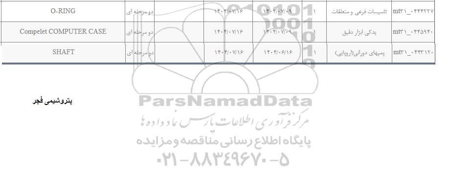 | mt31-0444227 | تاسیسات فرعی و متعلقات | 1 | 1404.07.9 | 1404.7.16 | دو مرحله ای | O - RING |