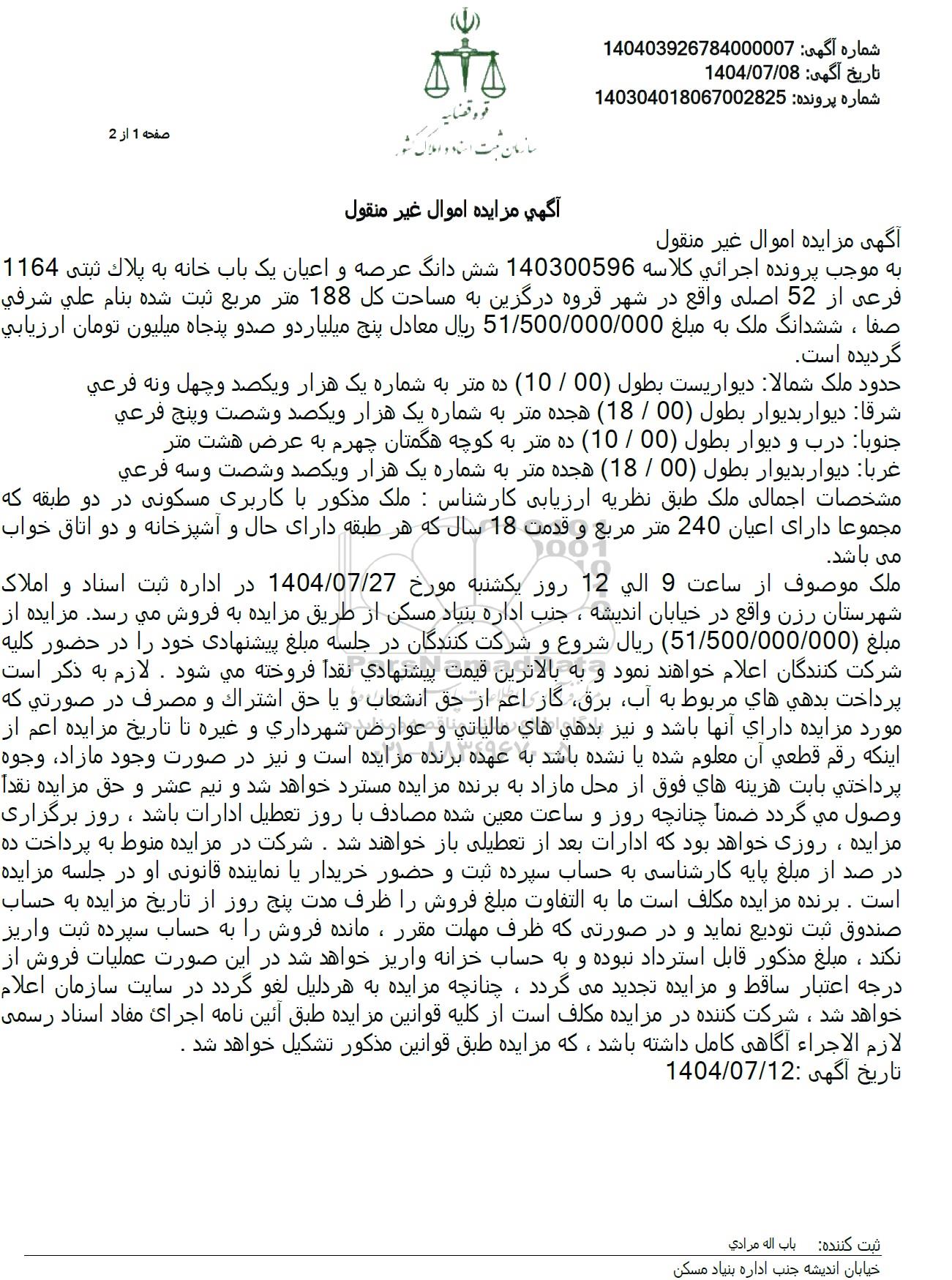 به موجب پرونده اجرائی کلاسه 140300596 شش دانگ عرصه و اعیان یک باب خانه به پلاک ثبتی 1164 فرعی از 52 اصلی واقع در شهر قروه در گزین به مساحت کل 188 متر مربع ثبت شده بنام علي شرفي صفا ، ششدانگ ملک به مبلغ 51.500.000.000 ریال معادل پنج میلیارد و صدو پنجاه میلیون تومان ارزيابي گردیده است.