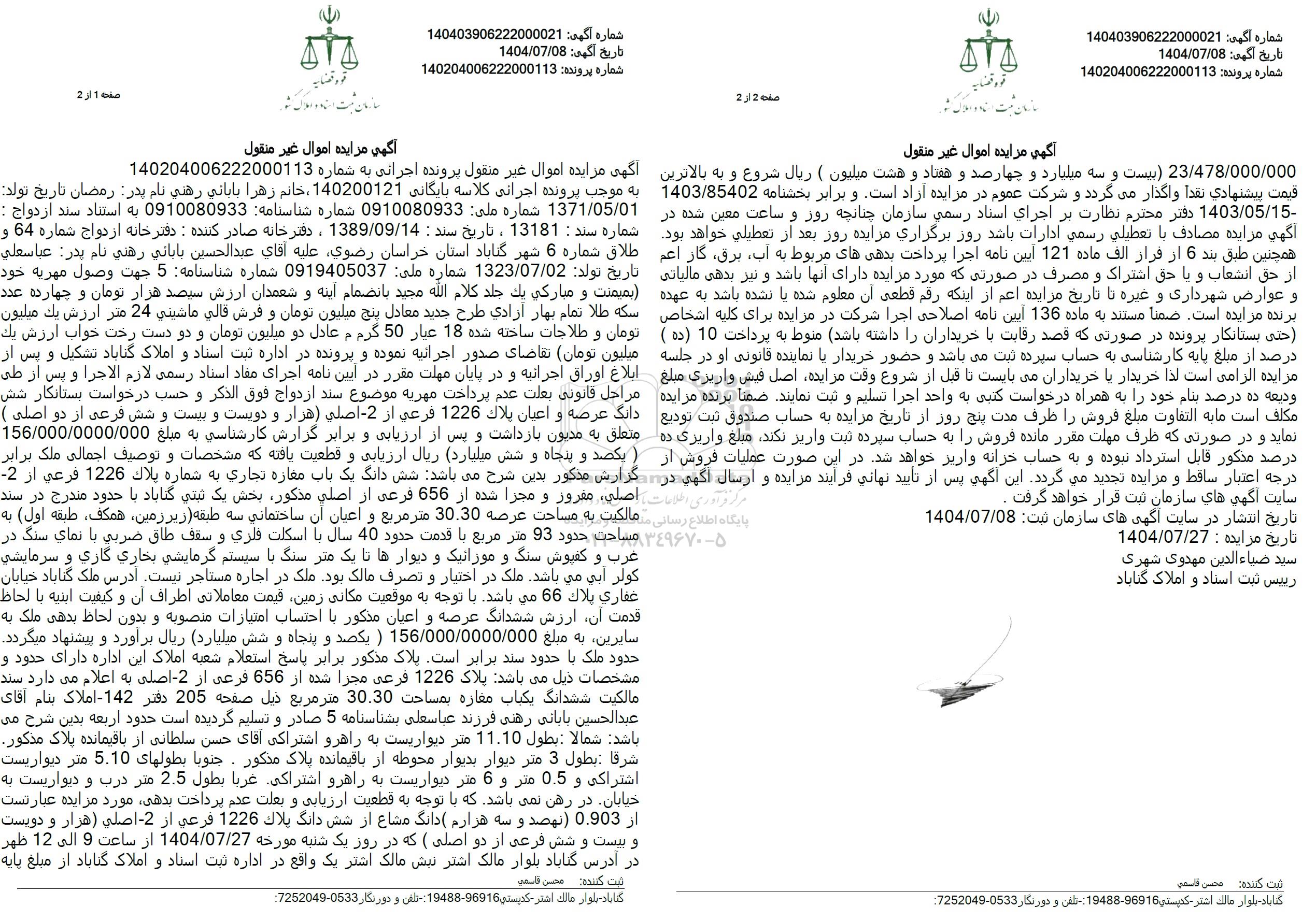 اگهی مزایده اموال غیر منقول آگهی مزایده اموال غیر منقول پرونده اجرائی به شماره 140204006222000113 به موجب پرونده اجرائی کلاسه پایگانی 140200121 خانم زهرا بابانی رهبی نام پدر رمضان تاریخ تولد: : 1371.05.01 شماره ملی 0910080933 شماره شناسنامه 0910080933 به استناد سند ازدواج شماره سند : 13181، تاريخ سند : 1389.09.14 ، دفترخانه صادر کننده : دفترخانه ازدواج شماره 64 و طلاق شماره 6 شهر گناباد استان خراسان رضوي عليه آقاي عبد الحسين باباتی رهنی نام پدر: عباسعلی تاریخ تولد: 1323.07.02 شماره ملی: 0919405037 شماره شناسنامه 5 جهت وصول مهریه خود (بميمنت و مباركي يك جلد كلام الله مجيد بانضمام اینه و شعمدان ارزش سیصد هزار تومان و چهارده عدد سکه طلا تمام بهار آزادي طرح جدید معادل پنج میلیون تومان و فرش قالی ماشينی 24 متر ارزش يک ميليون تومان و طلاجات ساخته شده 18 عیار 50 گرم و عادل دو میلیون تومان و دو دست رخت خواب ارزش بك میلیون تومان تقاضای صدور اجرائیه نموده و پرونده در اداره ثبت اسناد و املاک گناباد تشکیل و پس از ابلاغ اوراق اجرائیه و در پایان مهلت مقرر در این نامه اجرای مفاد اسناد رسمی لازم الاجرا و پس از طی مراحل قانونی بعلت عدم پرداخت مهریه موضوع سند ازدواج فوق الذکر و حسب درخواست بستانکار ششی دانگ عرصه و اعیان پلاك 1226 فرعي از 2- اصلی هزار و دویست و بیست و شش فرعی از دو اصلی ) متعلق به مدیون بازداشت و پس از ارزیابی و برابر گزارش کارشناسی به مبلغ 156.000.0000.000 ) یکصد و پنجاه و شش میلیارد ریال ارزیابی و قطعیت یافته که مشخصات و توصیف اجمالی ملک برابر گزارش مذکور بدین شرح میباشد شش دانگ یک باب مغازه تجاری به شماره پلاک 1226 فرعي از 2 اصلي، مفرور و مجرا شده از 656 فرعی از اصلی مذکور بخش یک تبتی گناباد با حدود مندرج در سند مالکیت به مساحت عرصه 30.30 متر مربع و اعیان آن ساختمانی سه طبقه زیرزمین همکف، طبقه اول به مساحت حدود 93 متر مربع با قدمت حدود 40 سال با اسکلت فلزی و سقف طاق ضربی با نمای سنگ در غرب و کفپوش سنگ و موزائیک و دیوارها تا یک متر سنگ با سیستم گرمایشی بخاری گازی و سرمایشی کولر آبی می باشد. ملک در اختیار و تصرف مالک بود ملک در اجاره مستاجر نیست. آدرس ملک گناباد خیابان غفاري بلاك 66 می باشد. با توجه به موقعیت مکانی زمین قیمت معاملاتی اطراف آن و کیفیت ابنیه با لحاظ قدمت آن ارزش ششدانگ عرصه و اعیان مذکور با احتساب امتیازات منصوبه و بدون لحاظ بدهی ملک به سایرین به مبلغ 156.000.0000.000 ) يكصد و پنجاه و شش میلیارد ریال برآورد و پیشنهاد میگردد. حدود ملک با حدود سند برابر است. پلاک مذکور برابر پاسخ استعلام شعبه املاک این اداره دارای حدود و مشخصات ذیل می باشد. پلاک 1226 فرعی مجزا شده از 656 فرعی از -2- اصلی به اعلام می دارد سند مالکیت ششدانگ یکباب مغازه بمساحت 30.30 متر مربع ذيل صفحه 205 دفتر 142 - املاک بنام آقای عبدالحسین پایانی رهنی فرزند عباسعلی بشناسنامه 5 صادر و تسلیم گردیده است حدود اربعه بدین شرح می باشد شمالا : بطول 11.10 متر دیواریست به راهرو اشتراکی آقای حسن سلطانی از باقیمانده پلاک مذکور شرقا بطول 3 متر دیوار بدیوار محوطه از باقیمانده پلاک مذکور جنوبا بطولهای 5.10 متر دیواریست اشتراکی و 0.5 متر و 6 متر دیواریست به راهرو اشتراکی غربا بطول 2.5 متر درب و دیواریست به خیابان در رقی نمی باشد که با توجه به قطعیت ارزیابی و بعلت عدم پرداخت بدهی مورد مزایده عبارتست از 0.903 نهصد و سه هزارم دانگ مشاع از شش دانگ پلاک 1226 فرعي از 2 اصلی قرار و دویست و بیست و شش فرعی از دو اصلی ) که در روز یک شنبه مورخه 1404.07.27 از ساعت 9 الى 12 ظهر در ادرس گناباد بلوار مالک اشتر پیش مالک اشتر یک واقع در اداره ثبت اسناد و املاک گناباد از مبلغ پایه 23.478.000.000 بیست و سه میلیارد و چهارصد و هفتاد و هشت میلیون ( ریال شروع و به بالاترین قیمت پیشنهادی نقدا واگذار می گردد و شرکت عموم در مزایده آزاد است و برابر بخشنامه 1403.85402 -1403.05.15 دفتر محترم نظارت بر اجرای استاد رسمی سازمان چنانچه روز و ساعت معین شده در اگهی مزایده مصادف با تعطیلی رسمی ادارا