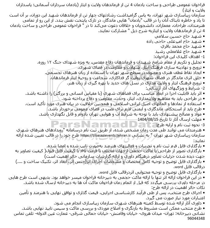 سازمان زیباسازی شهر تهران به پاس گرامیداشت رشادتهای چهار تن از فرماندهان شهید این دوران بر آن است تا یاد و خاطره تابناک آنان را در قالب یادمان هایی ماندگار در تارک پایتخت نقش بندد. از این رو از تمامی هنرمندان طراحان معماران دانشجویان و خلاقان دعوت میکند تا در فراخوان عمومی طراحی و ساخت یادمان