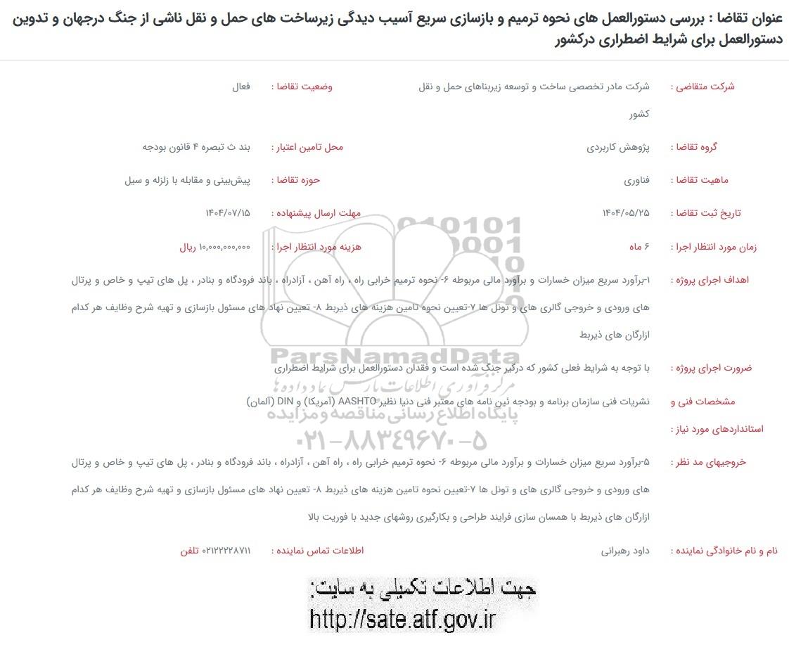 عنوان تقاضا : بررسی دستورالعملهای نحوه ترمیم و بازسازی سریع آسیب دیدگی زیرساختهای حمل و نقل ناشی از جنگ در جهان و تدوین دستورالعمل برای شرایط اضطراری در کشور