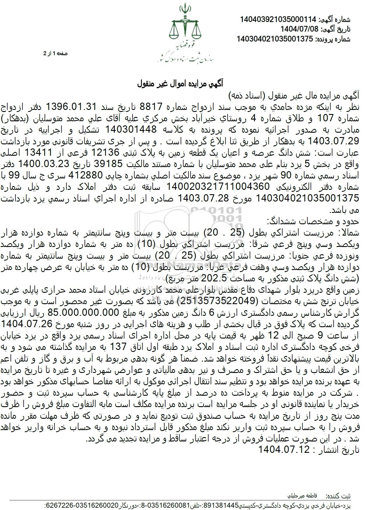 نظر به اینکه مژده حامدی به موجب سند ازدواج شماره 8817 تاریخ سند 1396.01.31 دفتر ازدواج شماره 107 و طلاق شماره 4 روستای خیرآباد بخش مرکزی علیه آقای علی محمد متوسلیان بدهکار) مبادرت به صدور اجرائیه نموده که پرونده به کلاسه 140301448 تشکیل و اجراییه در تاریخ 1403.07.29 به بدهکار از طریق ثنا ابلاغ گردیده است. و پس از جری تشریفات قانونی مورد بازداشت عبارت است شش دانگ عرصه و اعیان یک قطعه زمین به پلاک ثبتی 12136 فرعی از 13411 اصلی واقع در بخش 5 یزد بنام علی محمد متوسلیان با شماره مستند مالکیت 39185 تاریخ 1400.03.23 دفتر اسناد رسمی شماره 90 شهر یزد، موضوع سند مالكیت اصلی بشماره چاپی 412880 سری ج سال 99 با شماره دفتر الکترونیکی 140020321711004360 سابقه ثبت دفتر املاک دارد و ذیل شماره 140304021035001375 مورخ 1403.07.28 صادره از اداره اجرای اسناد رسمی یزد بازداشت می باشد.
