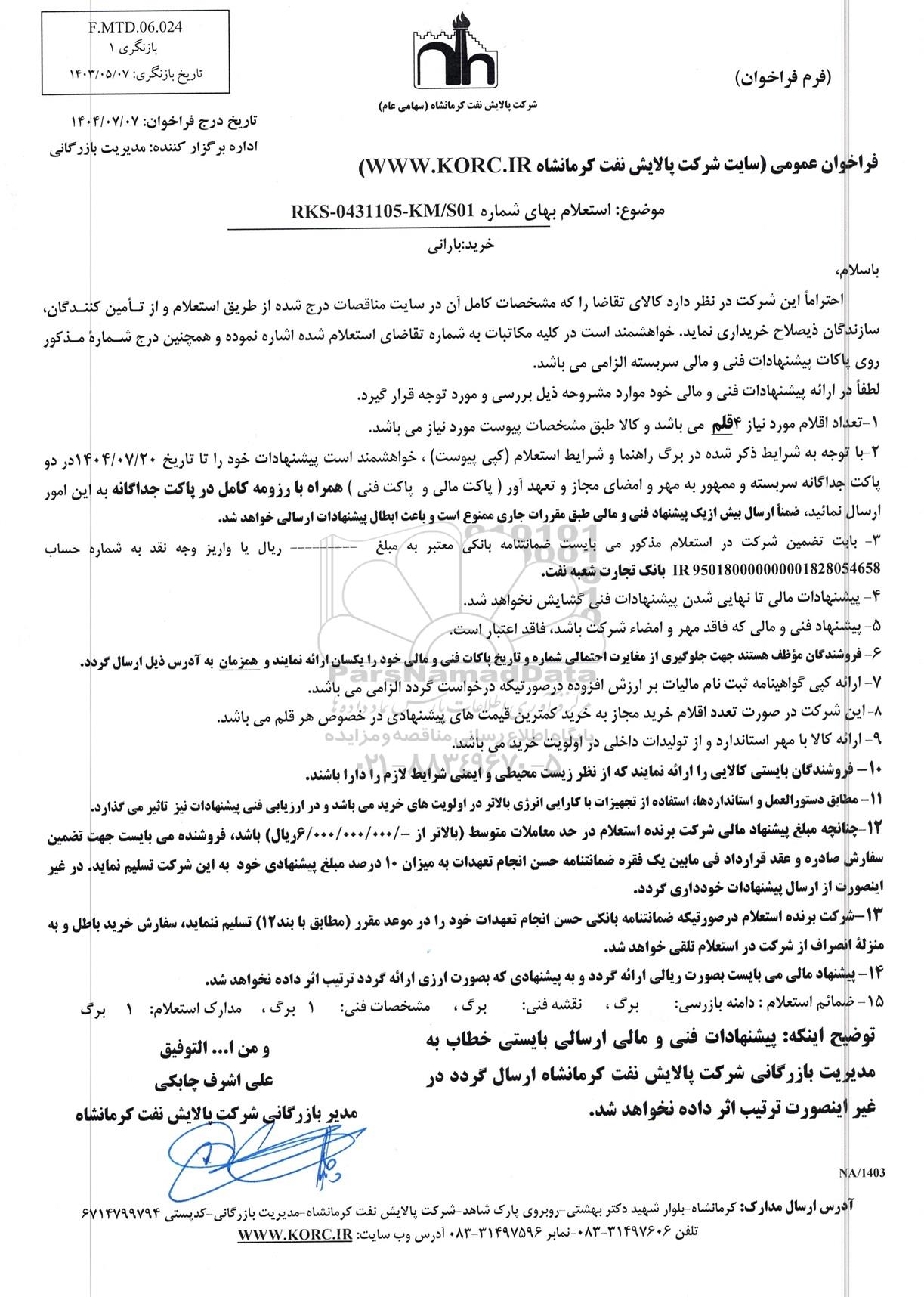 موضوع: استعلام بهای شماره RKS-0431105-KM/S01
