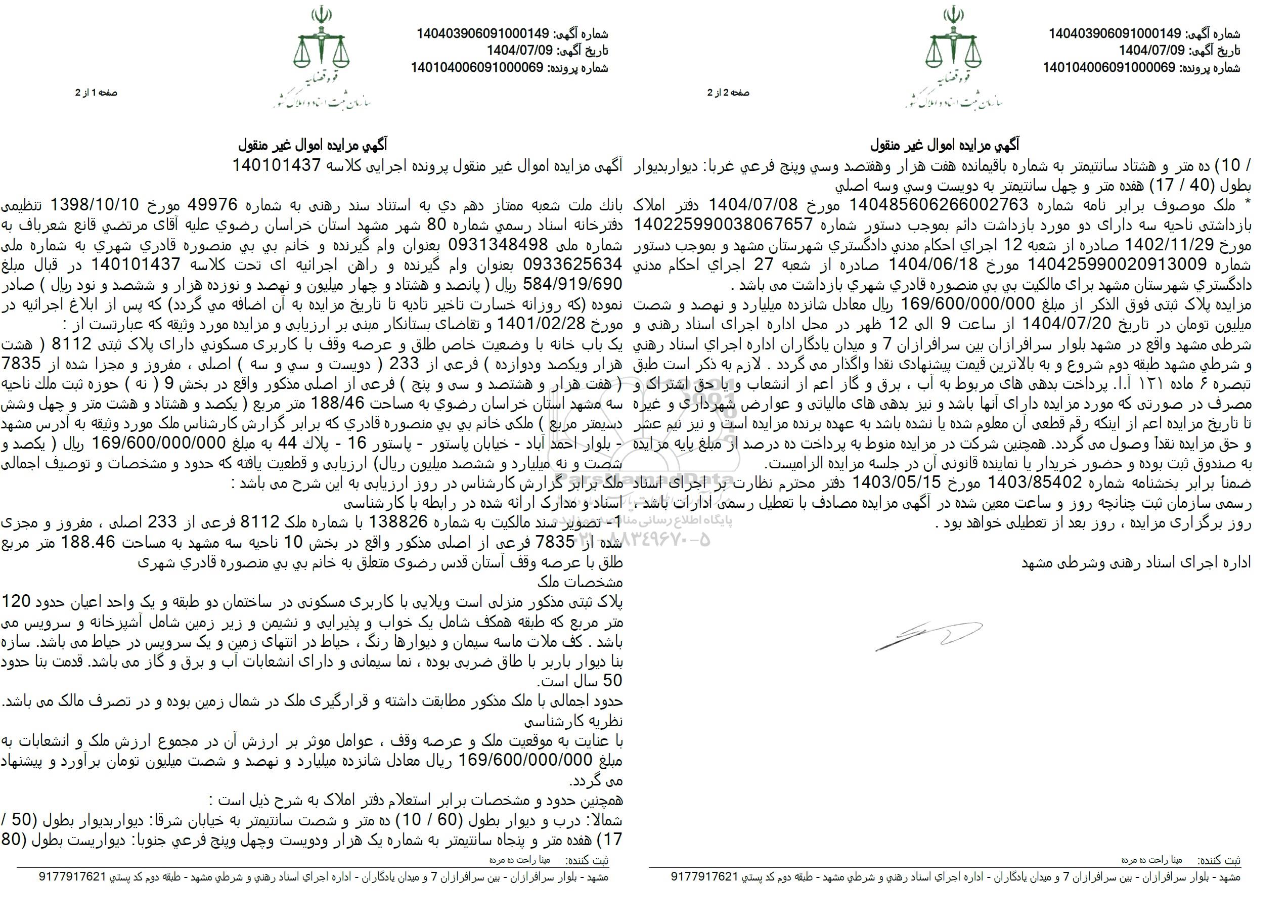 یک باب خانه با وضعیت خاص طلق و عرصه وقف با کاربری مسکونی دارای پلاک ثبتی 8112 هشت هزار و یکصد و دوازده ( فرعی از 233 ) دویست و سی و سه ( اصلی ، مفروز و مجزا شده از 835 هفت هزار و هشتصد و سی و پنج ( فرعی از اصلی مذکور واقع در بخش 9 ) نه ( حوزه ثبت ملك ناحي سه مشهد استان خراسان رضوی به مساحت 188/46 متر مربع ( یکصد و هشتاد و هشت متر و چهل و ششت دسیمتر مربع ( ملکی خانم بي بي منصوره قادری که برابر گزارش کارشناس ملک مورد وثیقه به آدرس مشهـ - بلوار احمد آباد - خیابان پاستور - پاستور 16 - پلاک 44 به مبلغ 169.600.000.000 ريال ( يكصد شصت و نه میلیارد و ششصد میلیون ریال ارزیابی و قطعیت یافته که حدود و مشخصات و توصيف اجمال ملک برابر گزارش کارشناس در روز ارزیابی به این شرح می باشد :