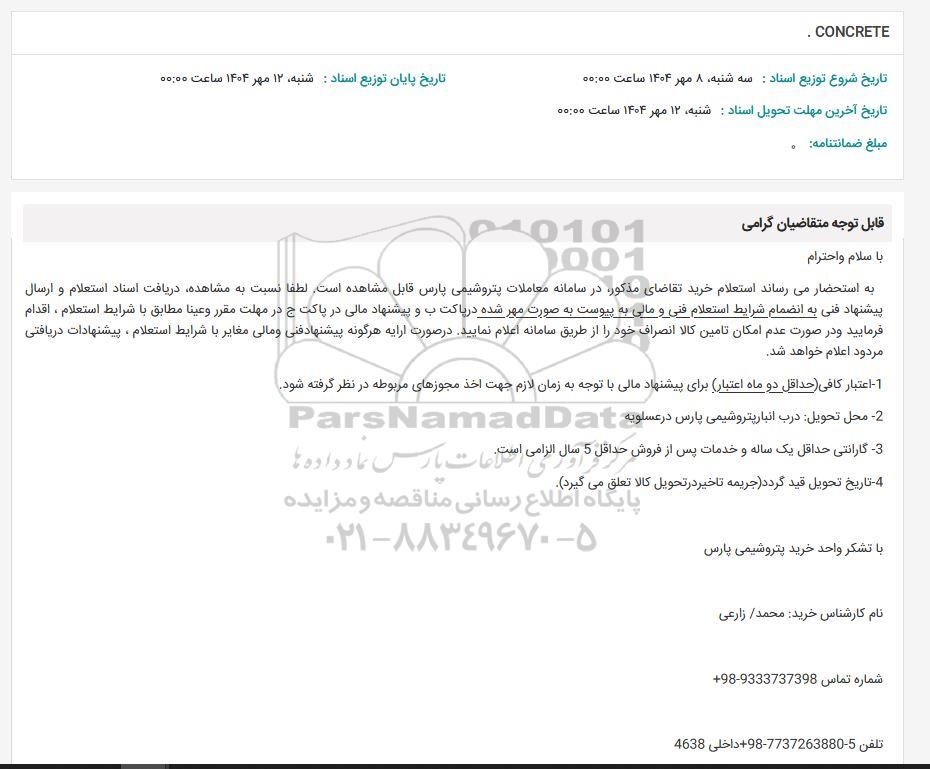 به استحضار میرساند استعلام خرید تقاضای مذکور در سامانه معاملات پتروشیمی پارس قابل مشاهده است. لطفا نسبت به مشاهده دریافت اسناد استعلام و ارسال پیشنهاد فنی به انضمام شرایط استعلام فنی و مالی به پیوست به صورت مهر شده در پاکت ب و پیشنهاد مالی در پاکت ج در مهلت مقرر و عینا مطابق با شرایط استعلام، اقدام فرمایید و در صورت عدم امکان تامین کالا انصراف خود را از طریق سامانه اعلام نمایید.
