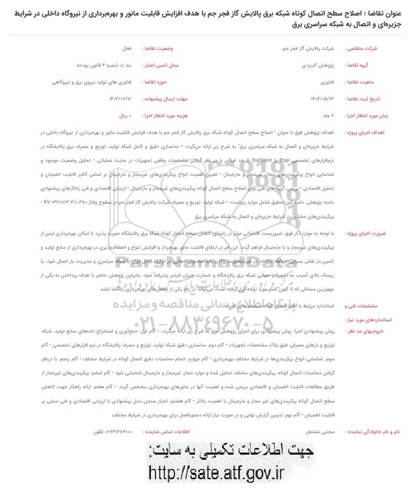 فراخوان اصلاح سطح اتصال کوتاه شبکه برق پالایش گاز...., فراخوان اصلاح سطح اتصال کوتاه شبکه برق پالایش گاز....