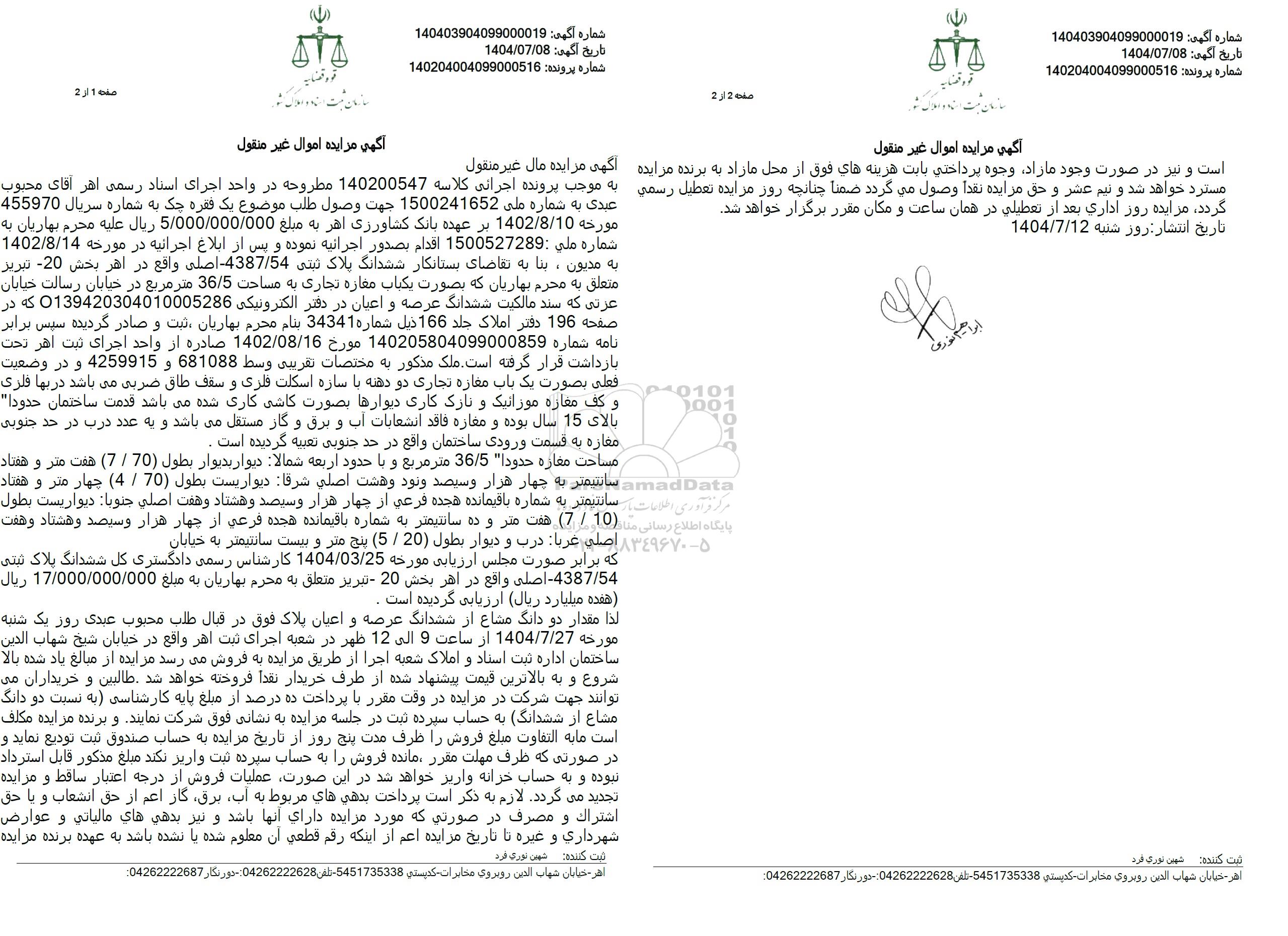 که برابر صورت مجلس ارزیابی مورخه 1404.03.25 کارشناس رسمی دادگستری کل ششدانگ پلاک ثبتی 4387.54- اصلی واقع در اهر بخش 20 تبریز متعلق به محرم بهاریان به مبلغ 17.000.000.000 ریال هفده میلیارد ریال ارزیابی گردیده است .