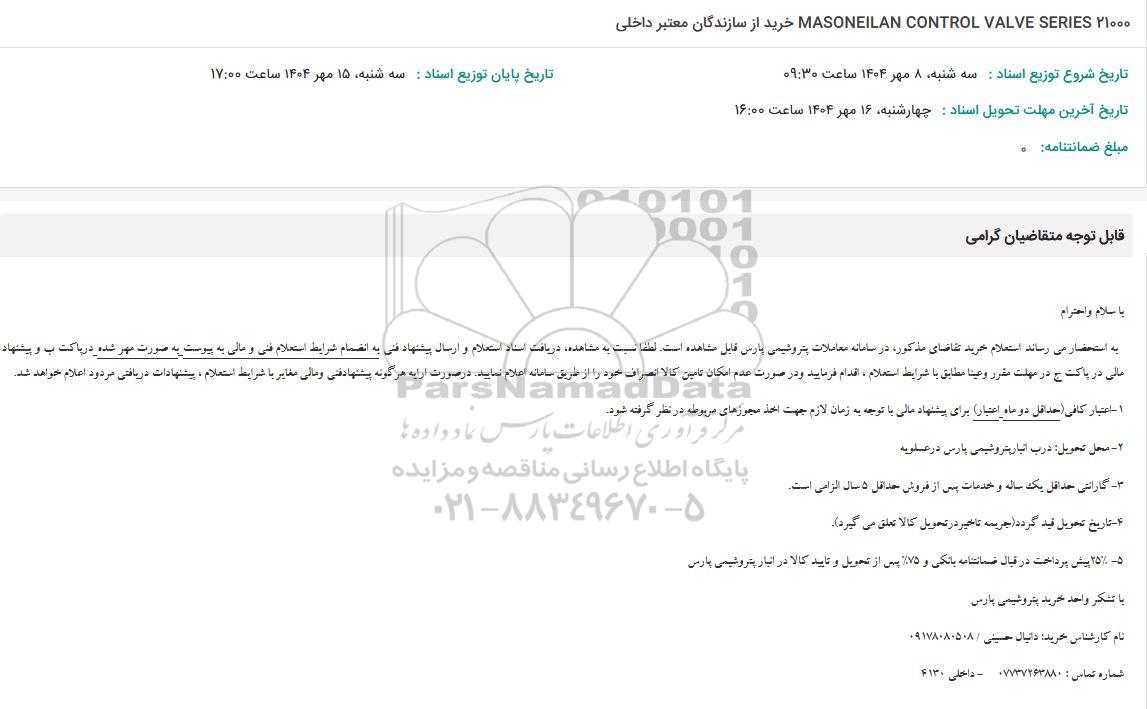 به استحضار میرساند استعلام خرید تقاضای مذکور در سامانه معاملات پتروشیمی پارس قابل مشاهده است.