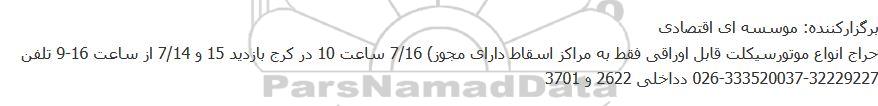 حراج انواع موتورسیکلت قابل اوراقی (فقط به مراکز اسقاط دارای مجوز) 7/16 ساعت 10 در کرج بازدید 15 و 7/14 از ساعت 16-9 تلفن 32229227-333520037-026 دداخلی 2622 و 3701