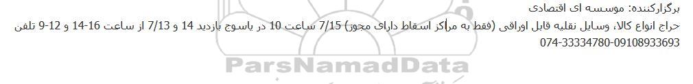 حراج انواع کالا، وسایل نقلیه قابل اوراقی (فقط به مراکز اسقاط دارای مجوز) 7/15 ساعت 10 در یاسوج بازدید 14 و 7/13 از ساعت 16-14 و 12-9 تلفن 09108933693-33334780-074