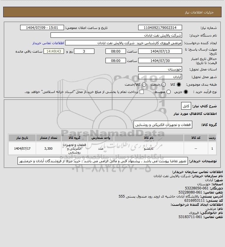 | 1 | -- | کابلشو | عدد | قطعات و تجهیزات الکتریکی و روشنایی | 3,300 | 1404/07/17 |