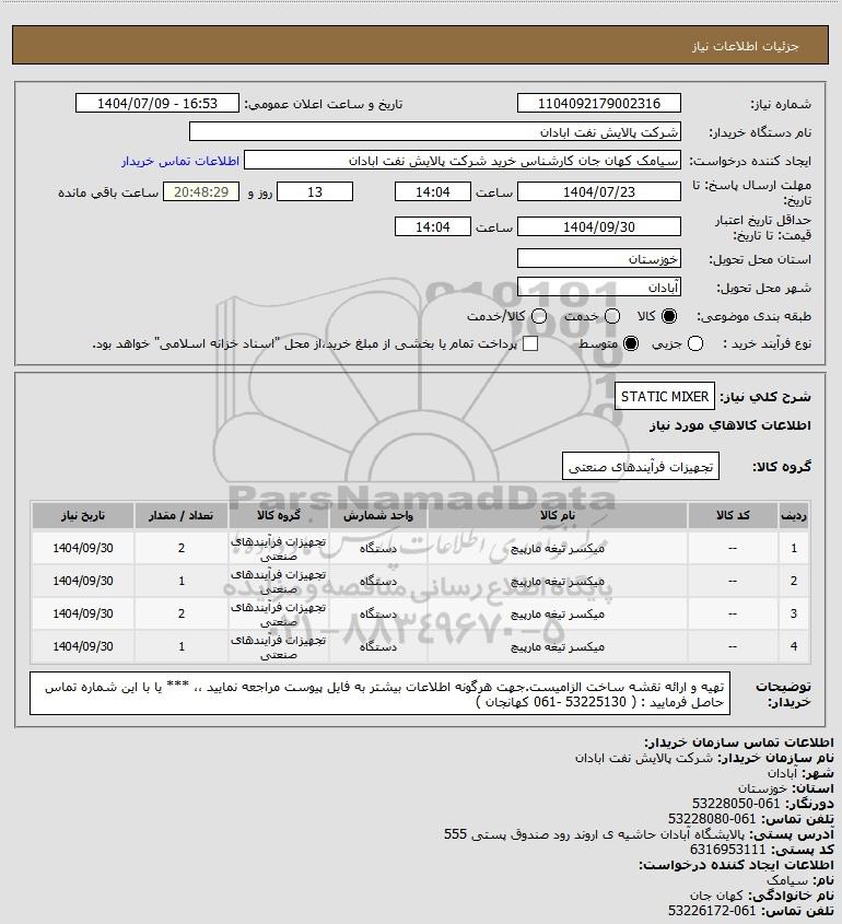 | 2 | -- | میکسر تیغه مارپیچ | دستگاه | تجهیزات فرآیندهای صنعتی | 1 | 1404/09/30 |