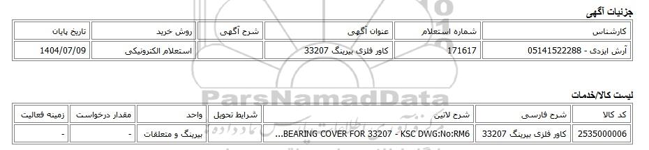 آرش ایزدی - 05141522288 | 171617 | کاور فلزی بیرینگ 33207 | استعلام الکترونیکی | 1404/07/09 |