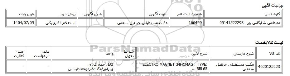 مصطفی شایگانی پور - 05141522298 | 166429 | مگنت مستطیلی جرثقیل سقفی | استعلام الکترونیکی | 1404/07/09 |