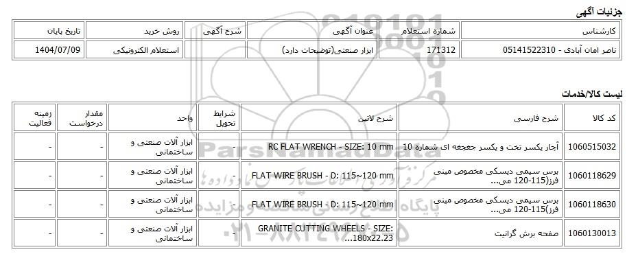 ناصر امان آبادی - 05141522310171312ابزار صنعتی(توضیحات دارد)استعلام الکترونیکی1404/07/09