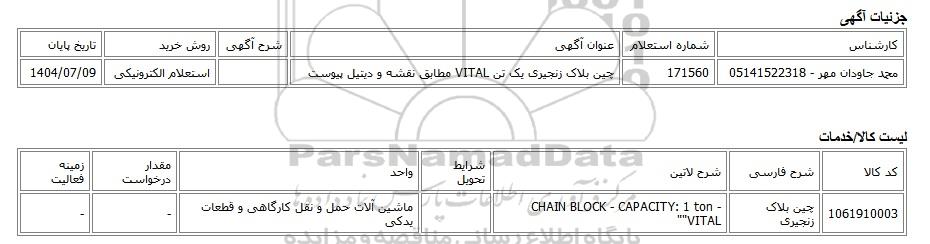 محمد جاودان مهر - 05141522318171560چین بلاک زنجیری یک تن VITAL مطابق نقشه و دیتیل پیوستاستعلام الکترونیکی1404/07/09
